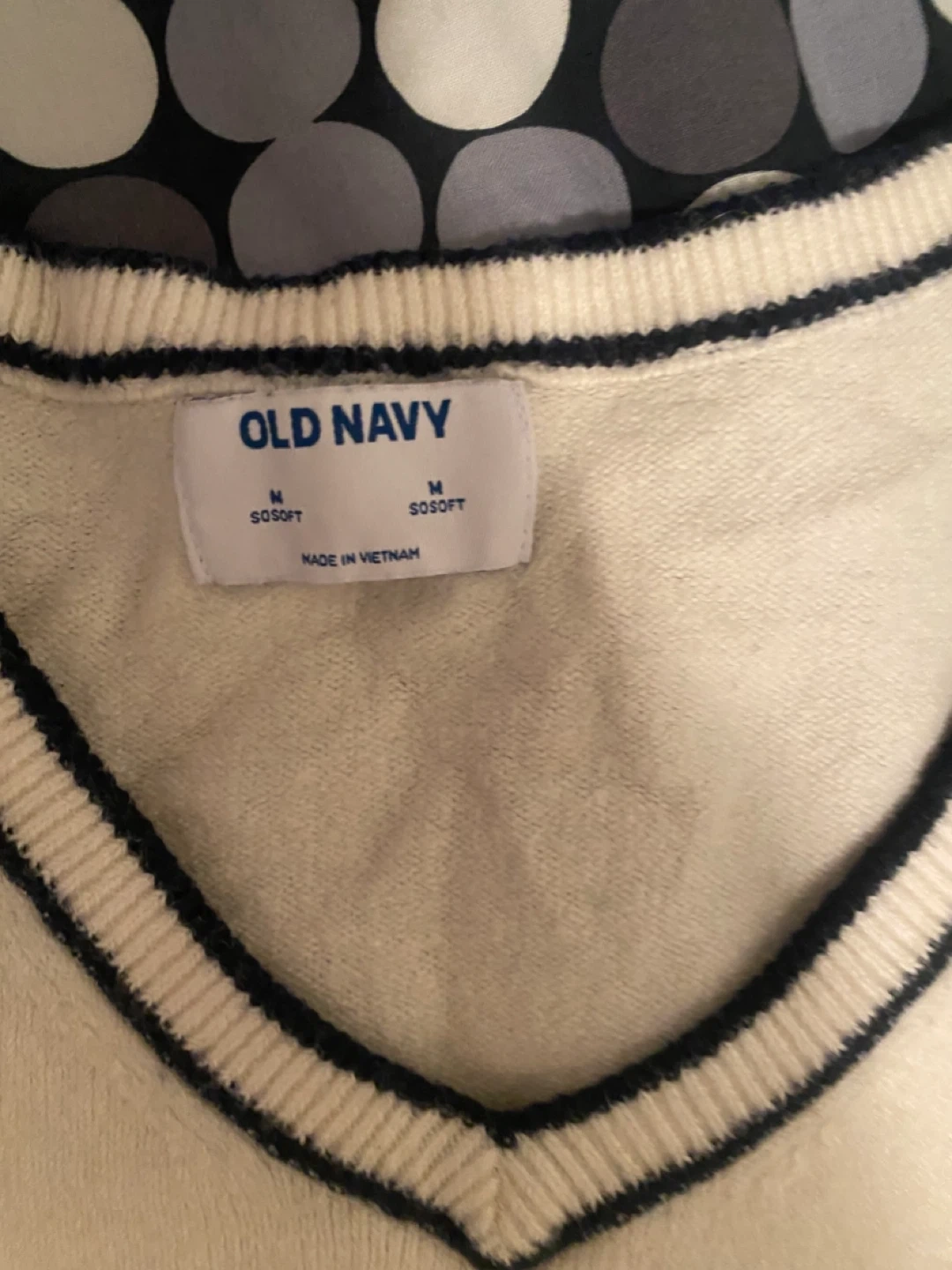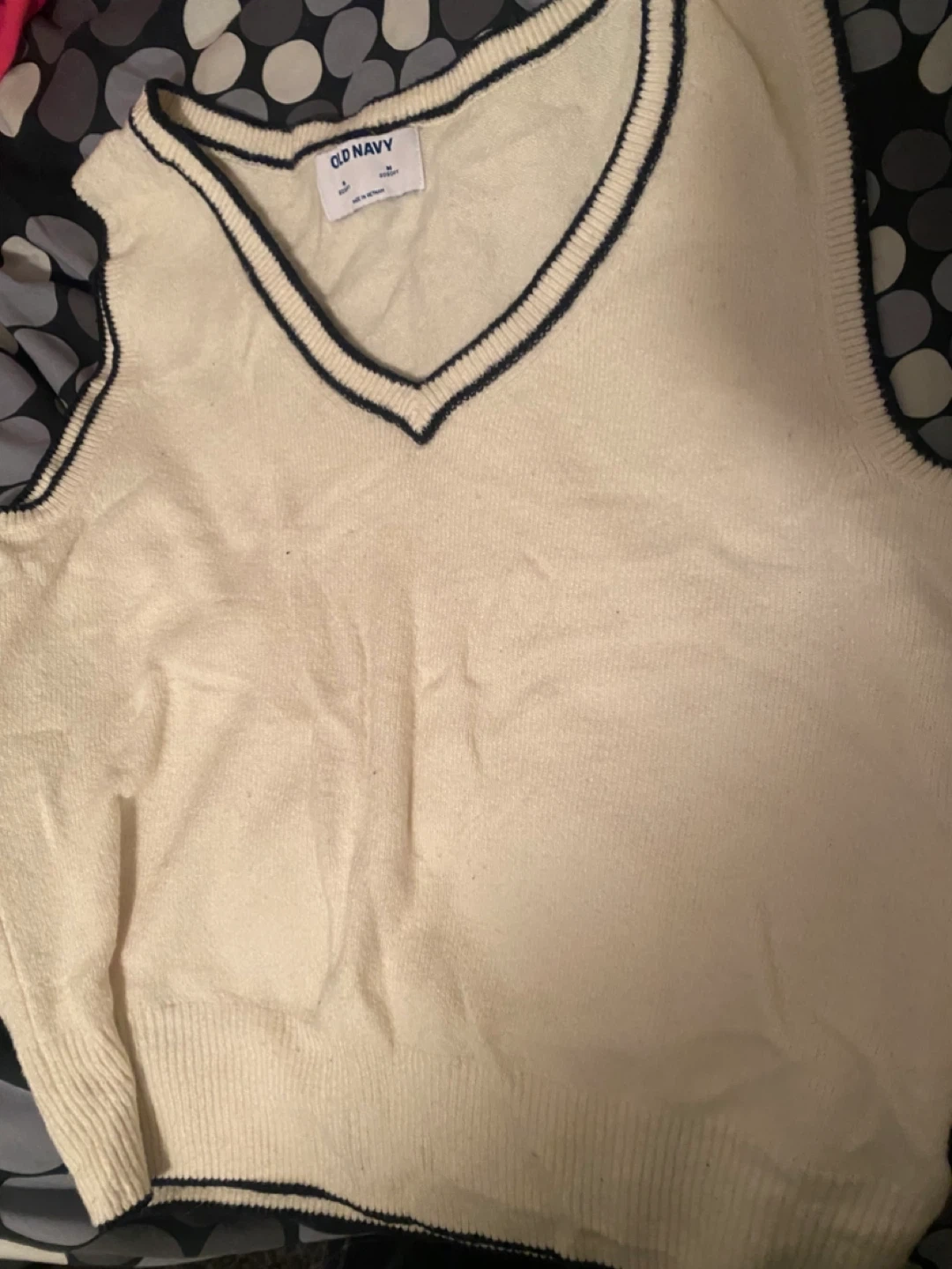 Cream knit sweater vest from Old Navy. It has a v-neckline with navy trim. Size medium. Made of 96% polyester and 4% spandex.