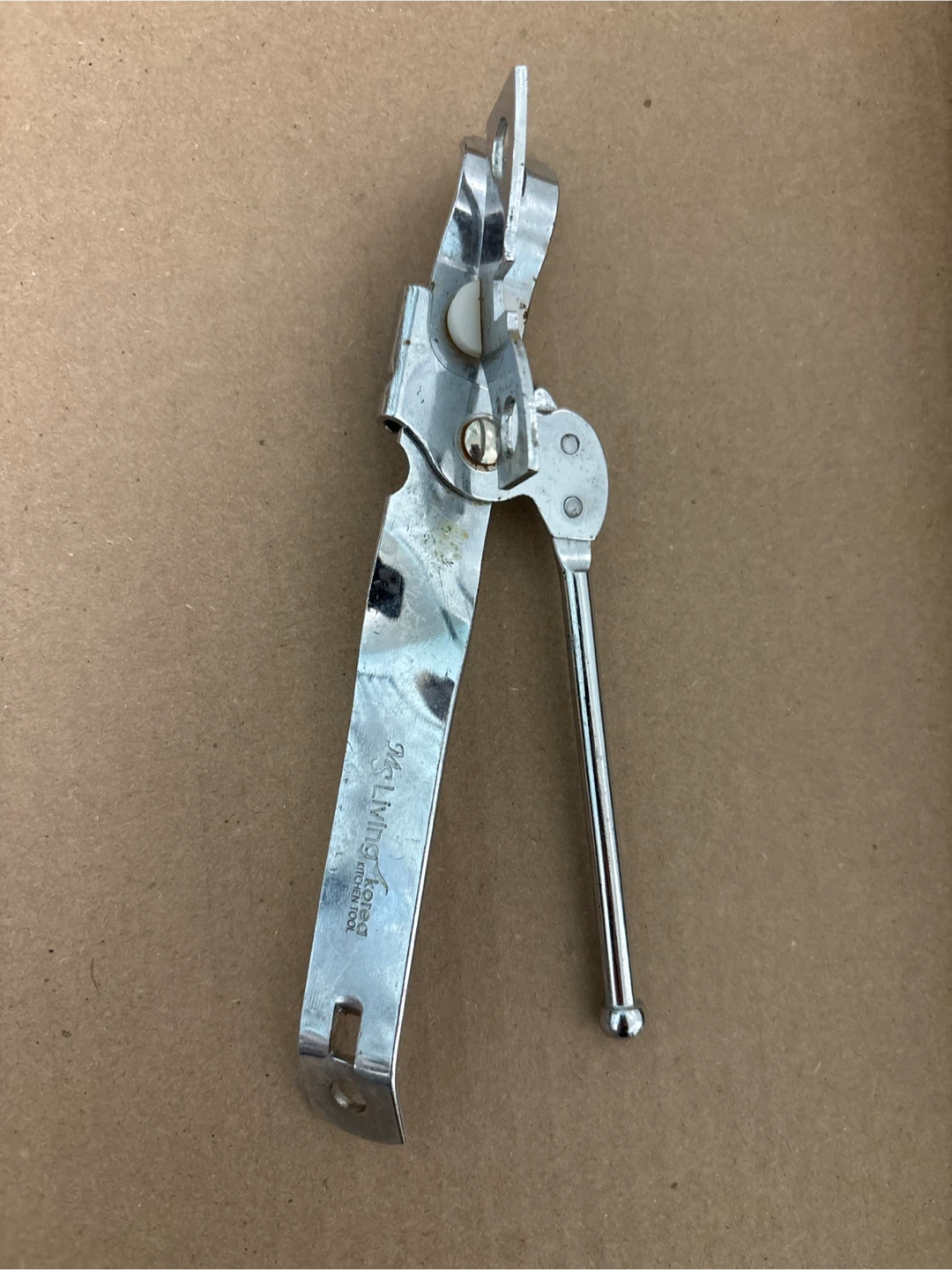 This is a metal can opener. It's a manual kitchen tool. Well used with some browning in the middle but still works