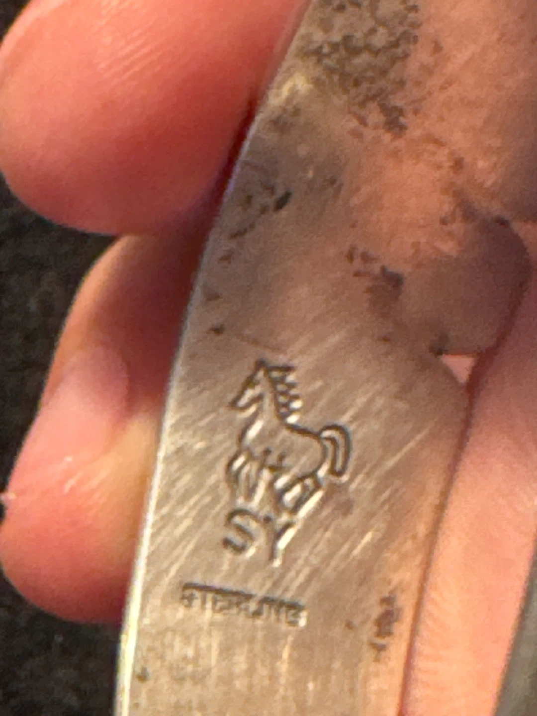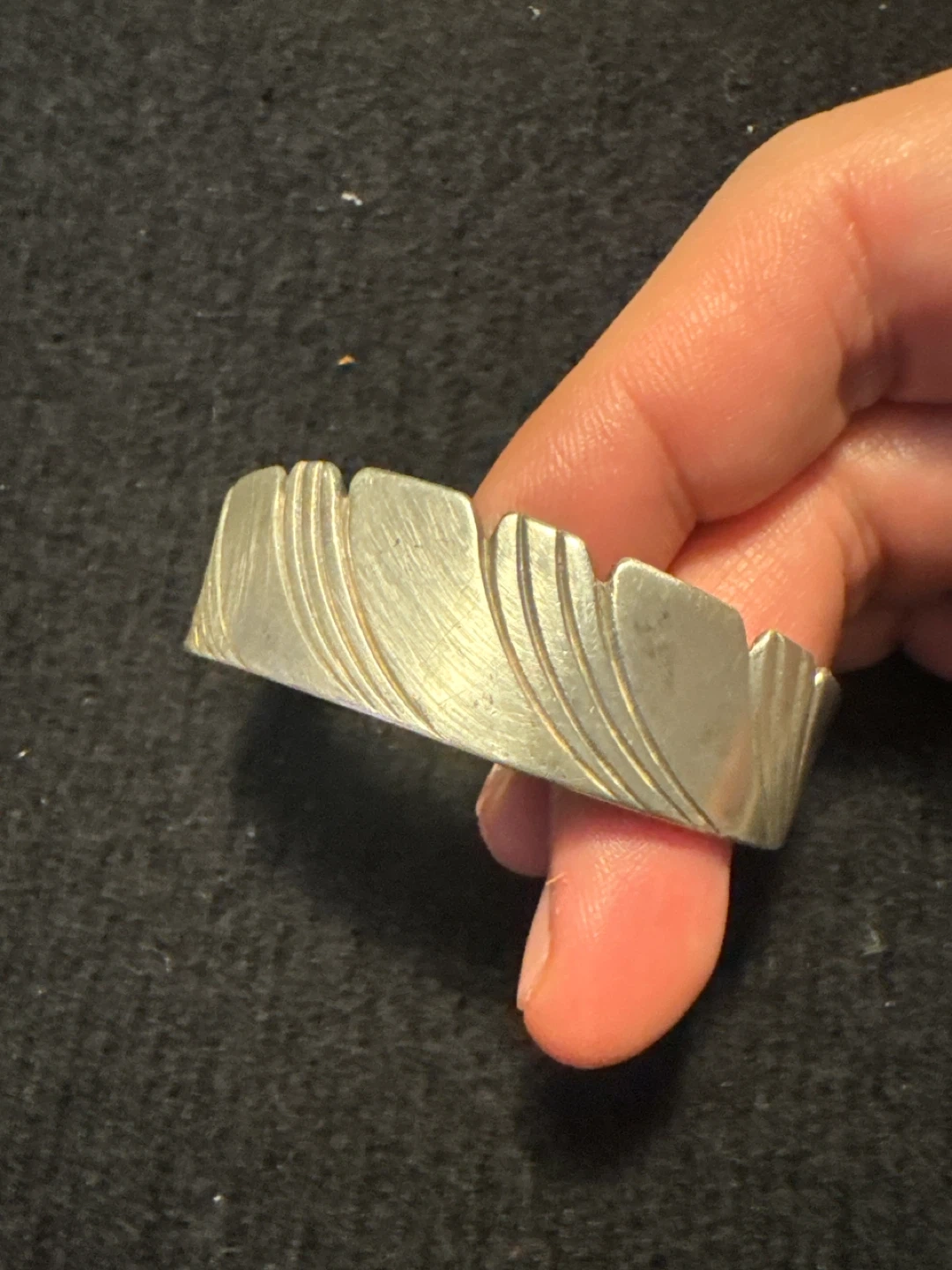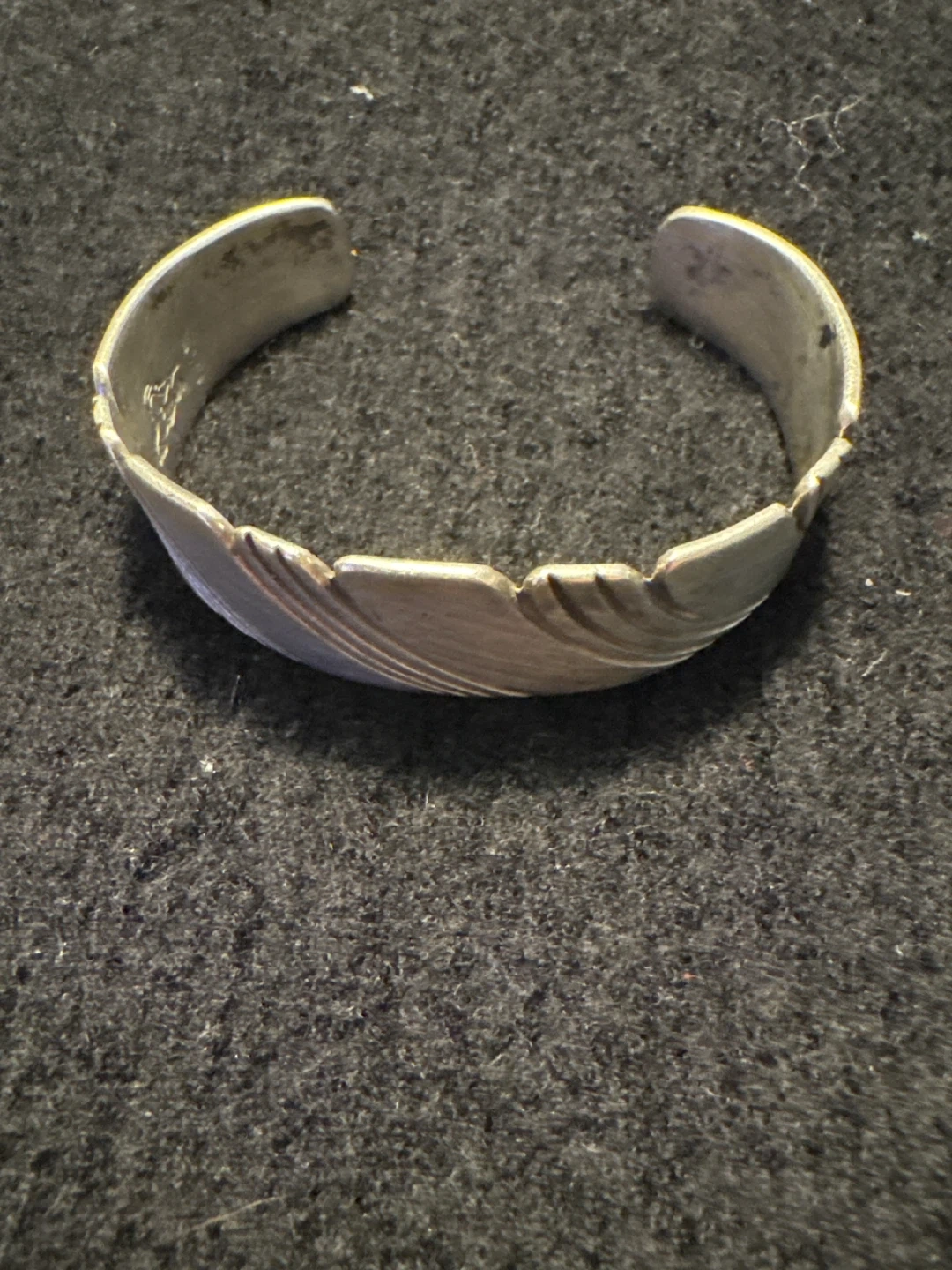 This is a sterling silver cuff bracelet with a horse and SY hallmark. It features a raised, etched wave pattern along the front. A timeless piece for any jewellery collection!