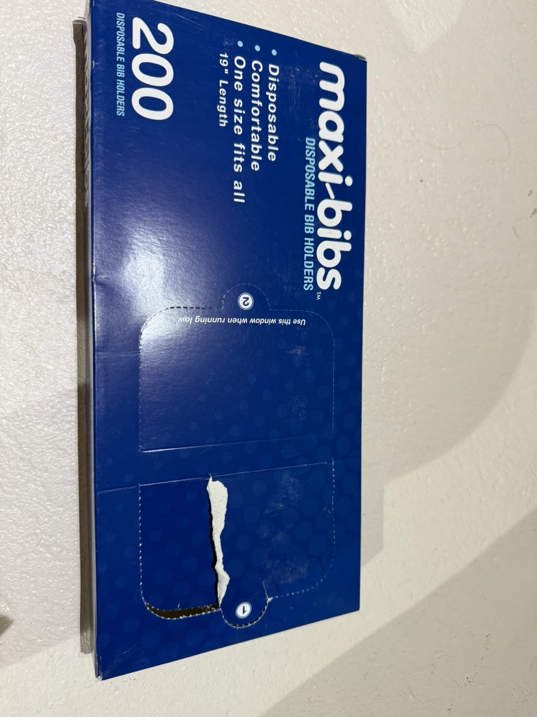 60Selling a box of Maxi-bibs disposable bib holders. The box contains approximately 100 bib holders. They are comfortable and one size fits all, with a length of 19 inches. Perfect for Dental student or medical students!