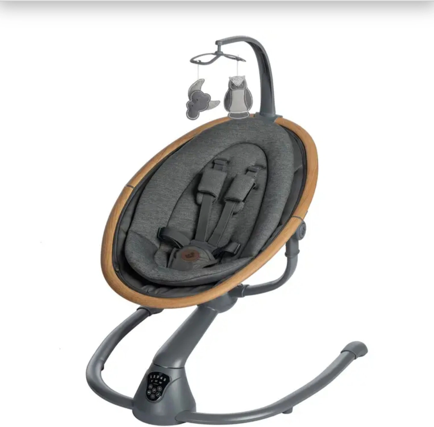 49Baby bouncer with wooden frame. Grey fabric seat. Includes mobile with hanging toys. only used twice. Original price is 350.