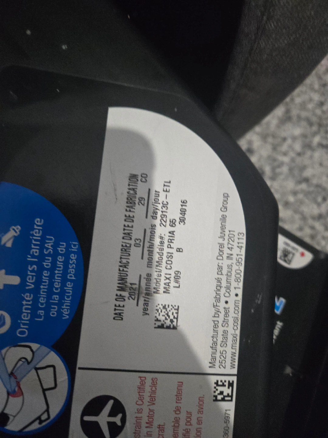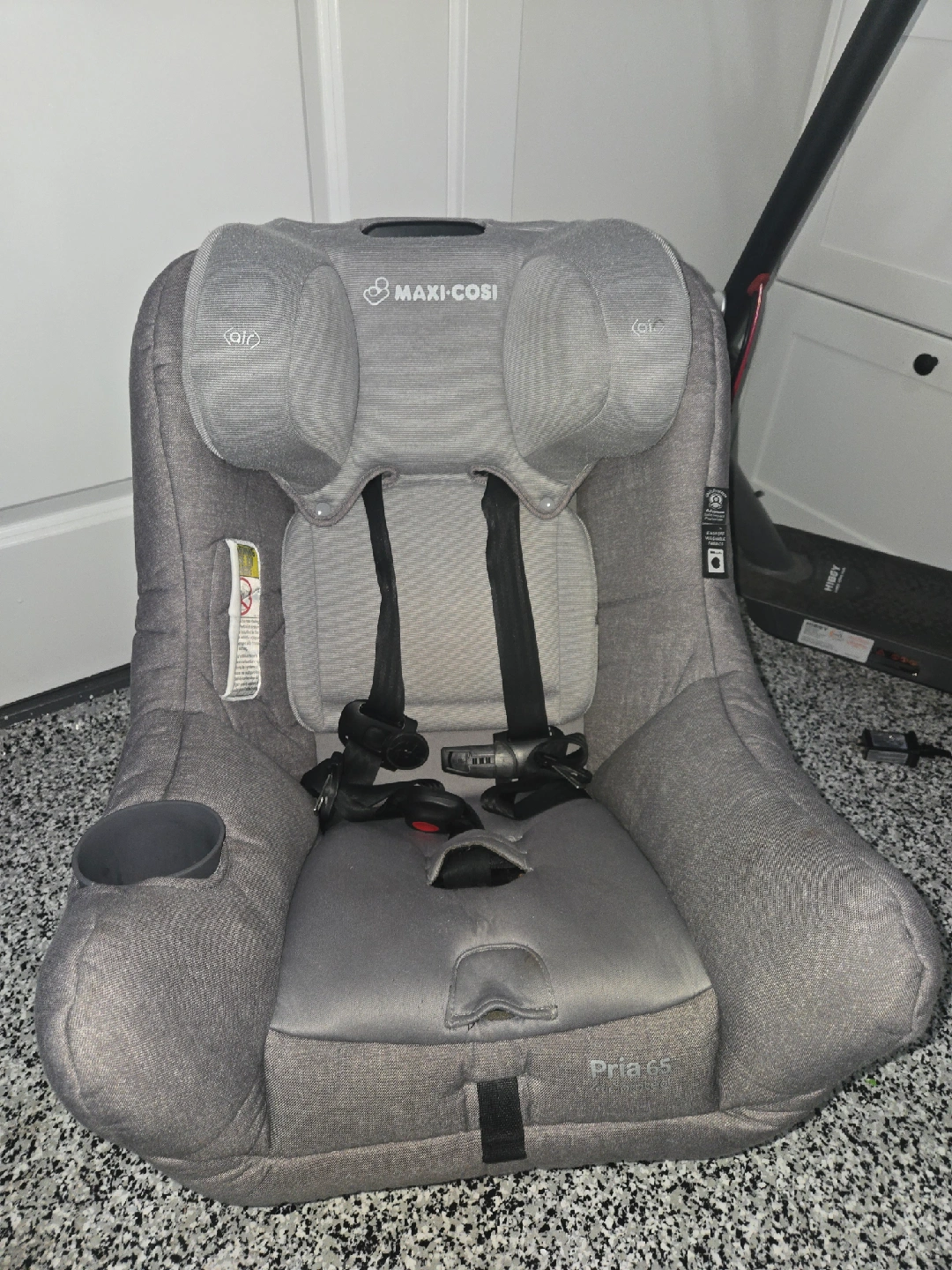 Selling a Maxi-Cosi Pria 65 car seat in great condition! It's a grey colour and manufactured in 2021 March 29. Clean and Accideng free! This car seat is ready for a new home! Infant inserts included but not pictured.