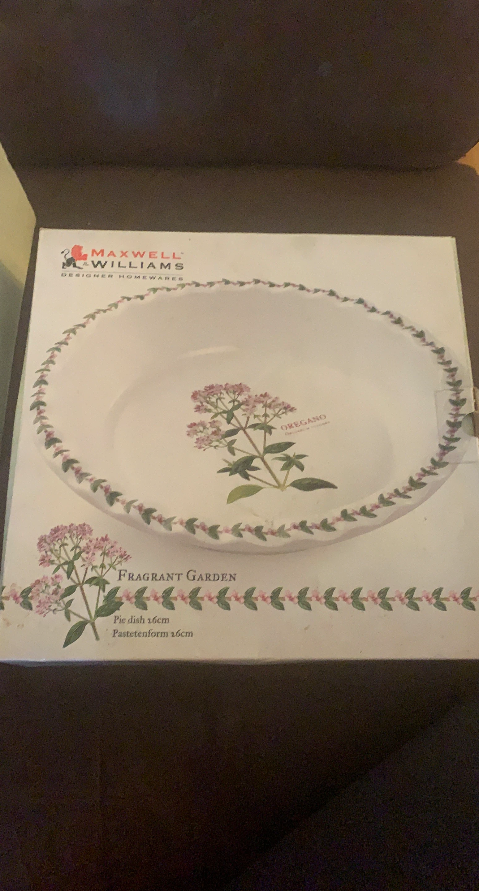 38Selling a Maxwell & Williams Designer Homewares pie dish from the Fragrant Garden collection. It's 26cm in diameter and features a lovely floral design around the rim and in the centre. The box is included!
