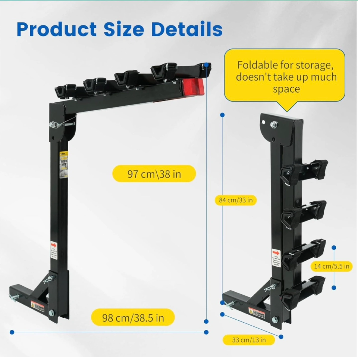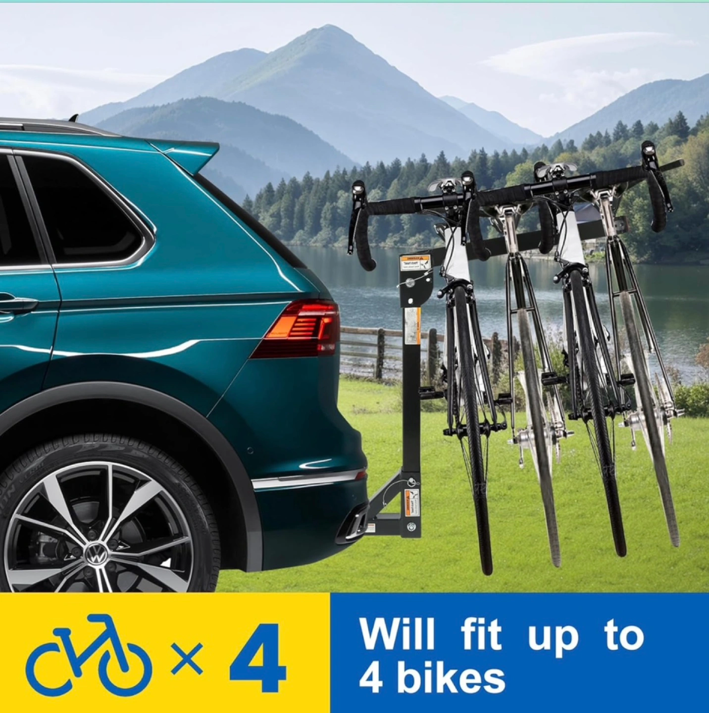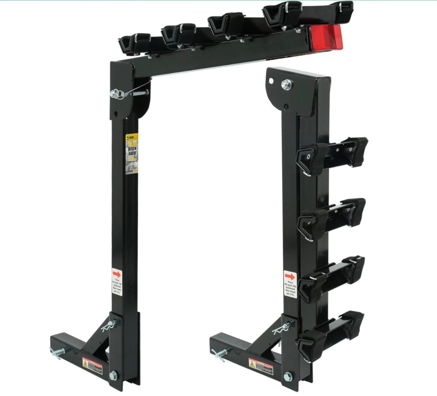 Brand New unopened box. Four-bike capacity hitch mount. Fits 2 inch receivers. Adjustable bike cradle with hook and loop straps. Folds down for trunk access. Quick hitch pins included. Heavy-duty steel construction. 150 lb maximum capacity. Item weight 25 lbs. Dimensions: h38xl38.5xw13. Only available for pickup.