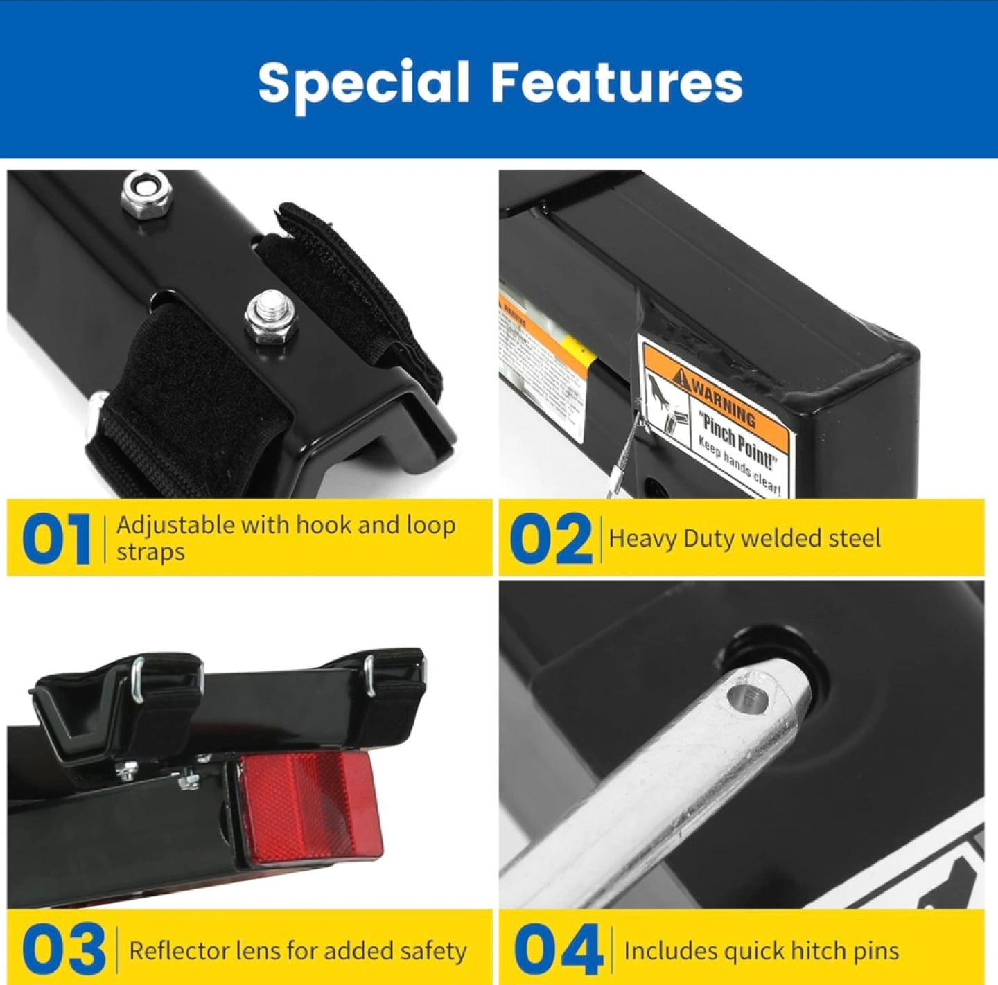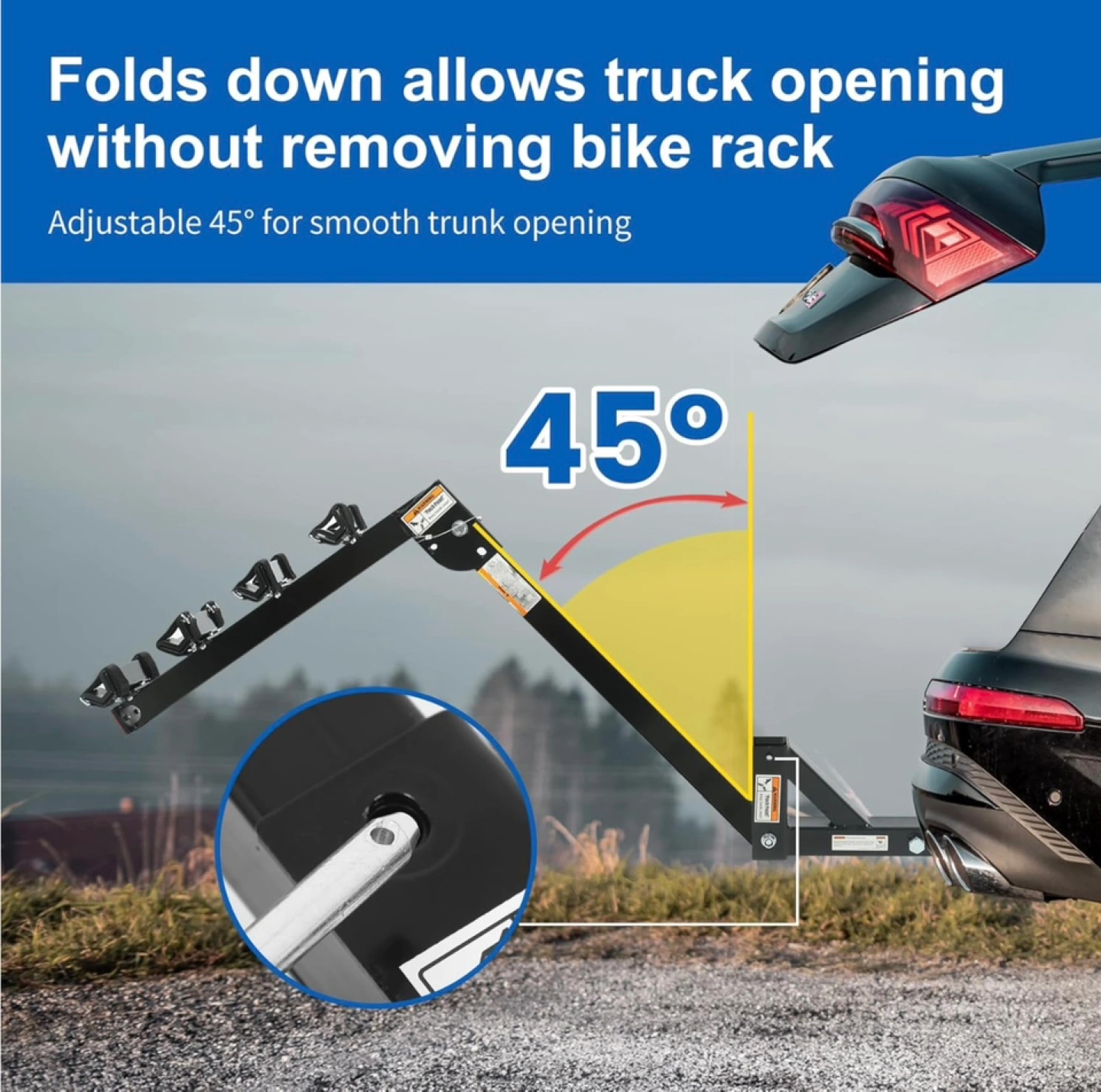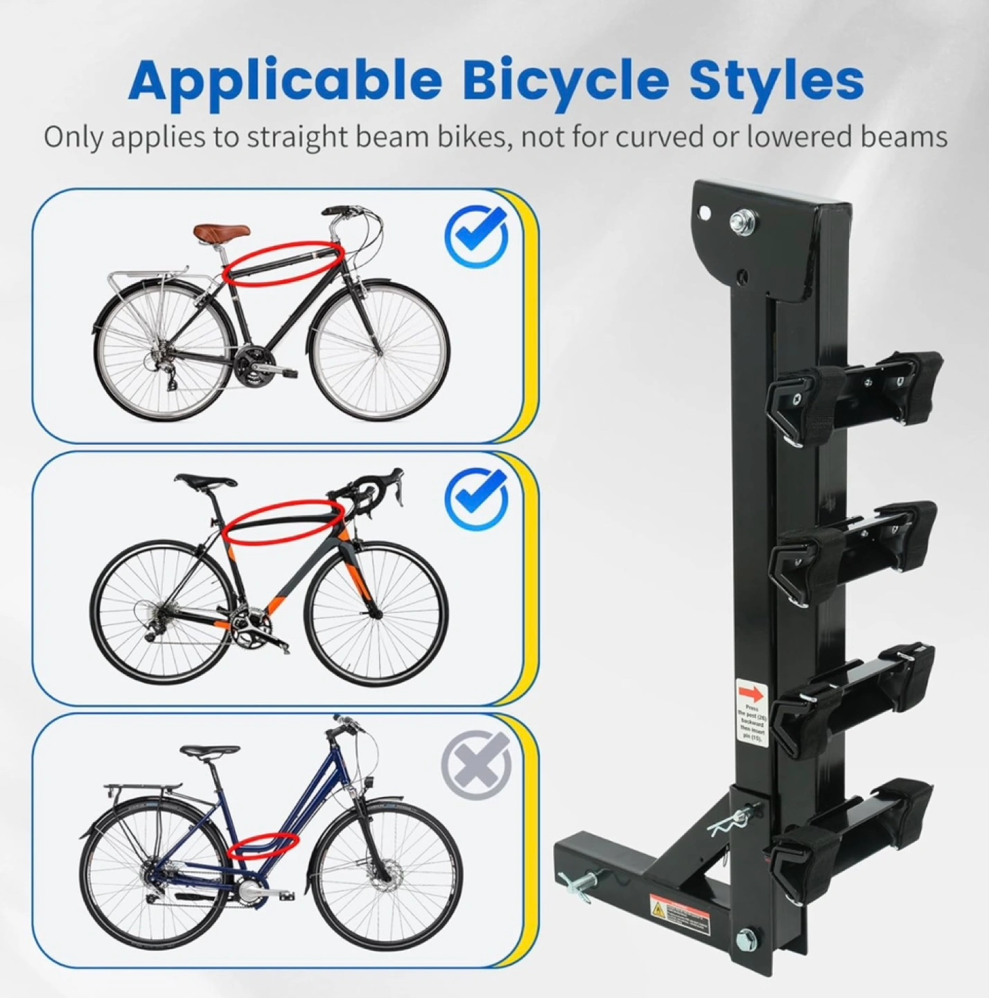 Brand New unopened box. Four-bike capacity hitch mount. Fits 2 inch receivers. Adjustable bike cradle with hook and loop straps. Folds down for trunk access. Quick hitch pins included. Heavy-duty steel construction. 150 lb maximum capacity. Item weight 25 lbs. Dimensions: h38xl38.5xw13. Only available for pickup.