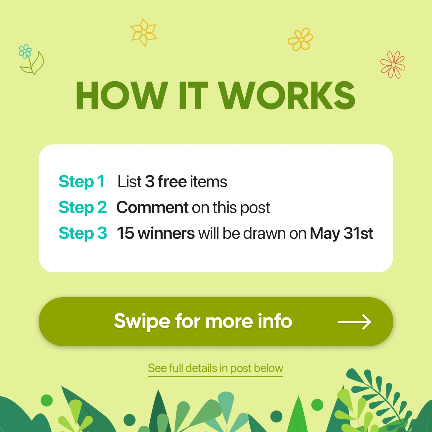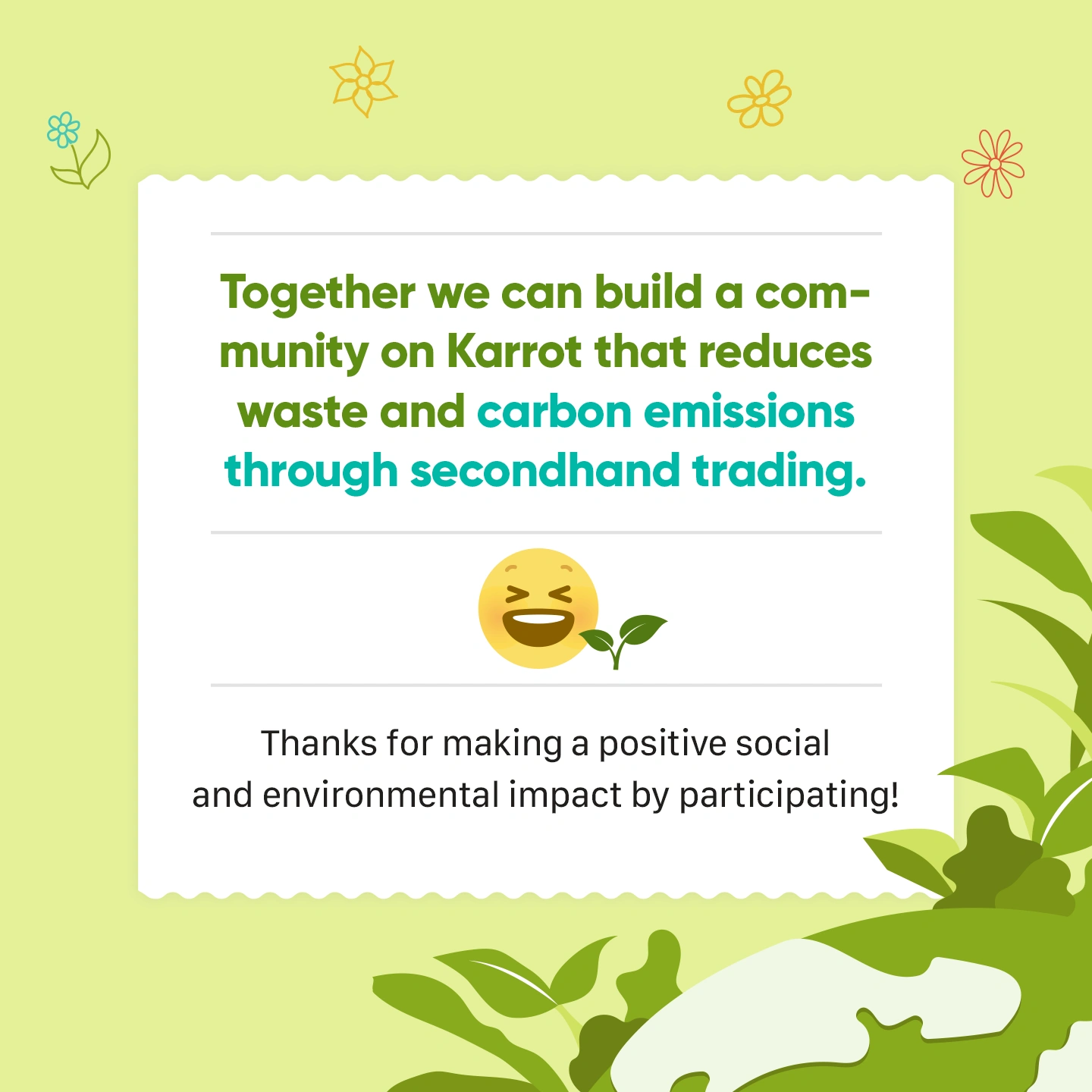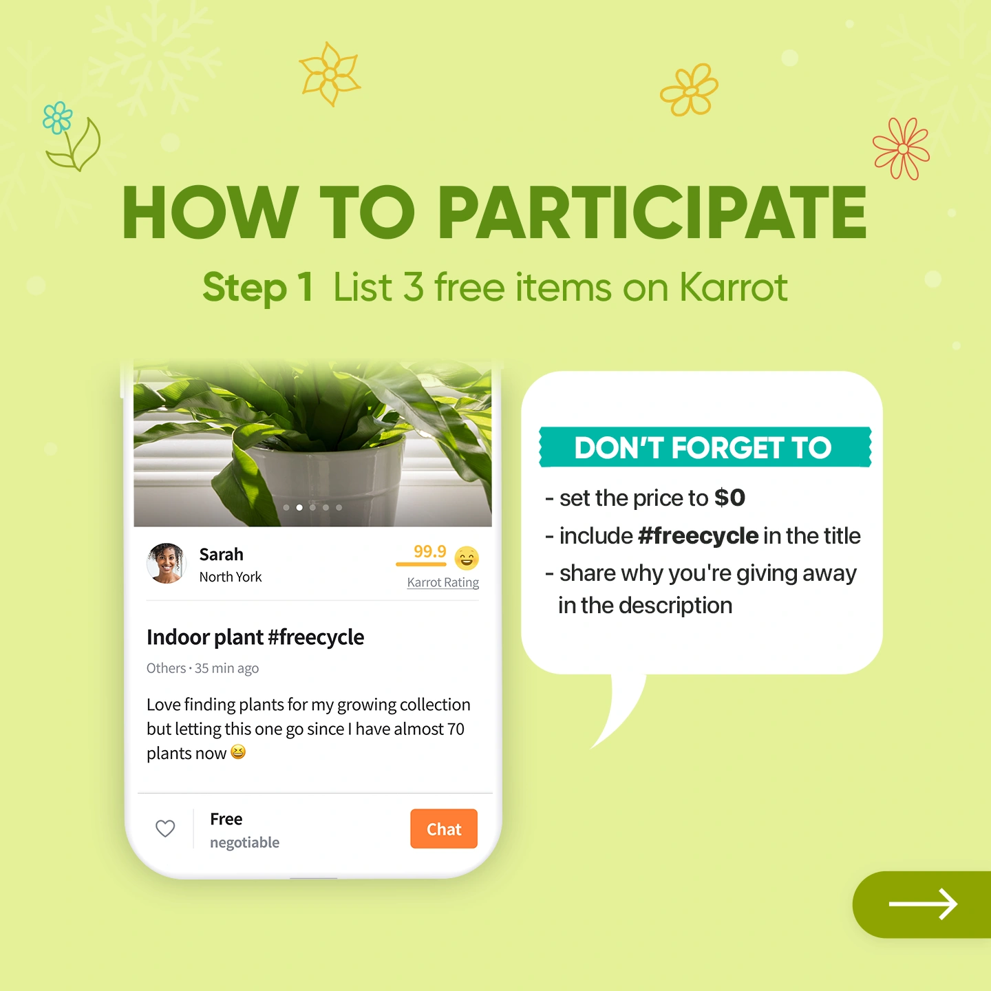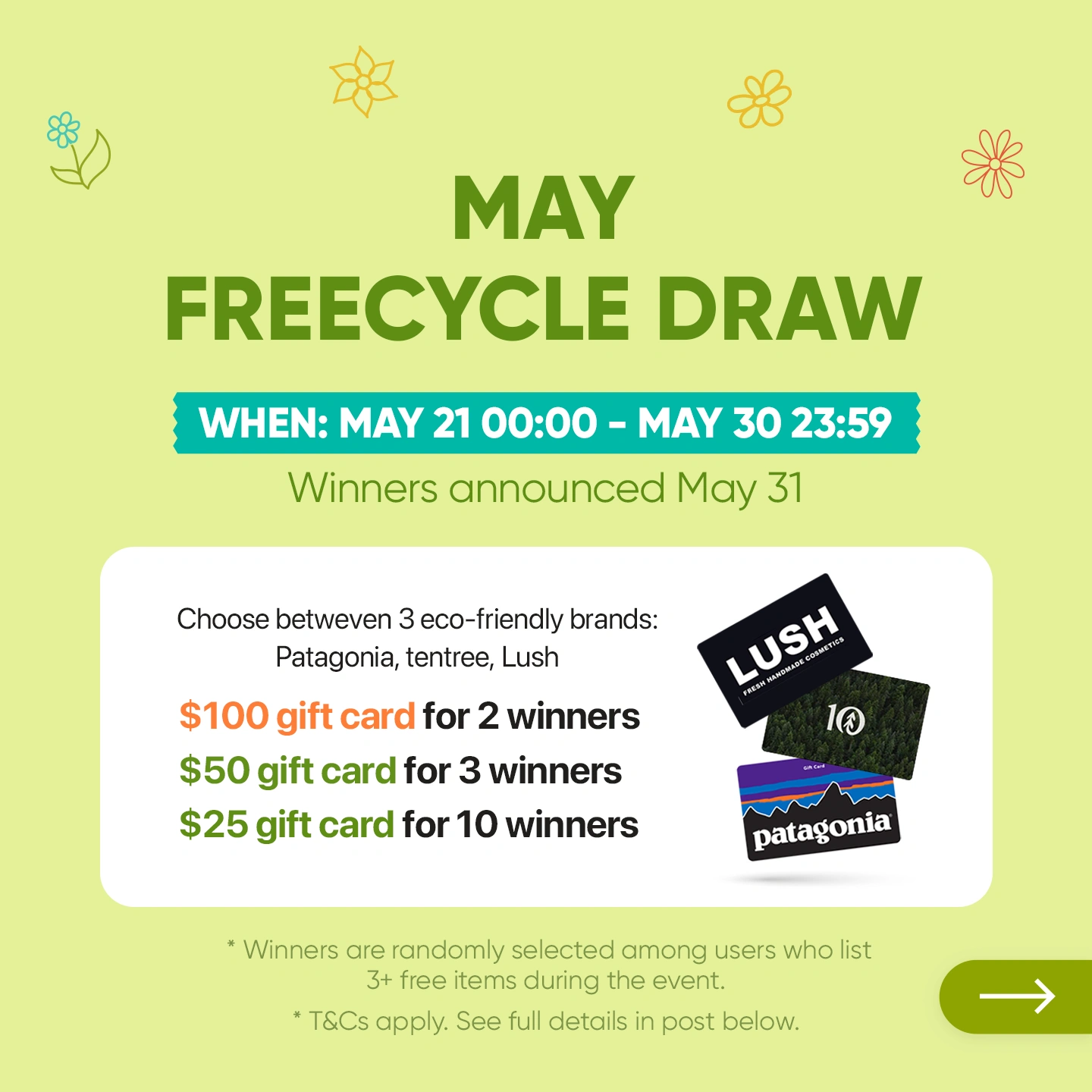 1000+Hey Karrot family! For this month’s Freecycle it’s time to Spring Clean and GO GREEN 🍃 Are you procrastinating your Spring cleaning? Still got a pile of clutter at home? Not to worry! Join us for this month’s Freecycle event and get rid of items you no longer need. When you participate in secondhand trading on Karrot you’re helping to make the world a greener place by reducing waste and carbon emissions. At Karrot, we want to create a community that strives to make a positive environmental impact, which is why for the prize this month we decided to give out gift cards for 3 eco-friendly brands - Patagonia, tentree, & Lush. 💚 🎁 Prize: $100 gift card for 2 winners, $50 gift card for 3 winners, $25 gift card for 10 winners! What: Your choice between Patagonia, tentree, Lush 🥕 How it works: Step 1. List 3 free items on Karrot. Set the price to $0, and include #freecycle in the title Step 2. Comment on this post about your participation & experience on Karrot! Step 3. Wait for the winner announcement on May 31st 🥕 More tips for freecycling: ✔︎ Share why you're giving away and the new owner will appreciate it more. ✔︎ Share this event and get your neighbours to join in. Get ready to Spring Clean & Go Green with us 🌷 Patagonia patagonia.ca : Retailer of outdoor clothing. A high proportion of its materials are made from recycled fabrics, and it’s business model rejects fast fashion by creating high-quality, long-lasting products. tentree Apparel tentree.ca : A Canadian clothing brand using sustainably sourced fabrics for a ZeroWaste Future. As the name suggests, they plant 10 trees for every piece of clothing sold. Lush lush.ca : A cosmetics brand known for it’s “naked” packaging with around 65% of their all-year-round products sold without any packaging. The rest are packaged using recycled and recyclable materials. Terms and Conditions - Users who upload three or more "freecycling listings" between May 21 0:00 - May 30 23:59 will be counted as valid entry. - Listings with price set at $0 with #freecycle tag in the title will be counted as a valid "freecycling listing". - Winners will be randomly selected. - Users can only win one prize. - This promotion is only open to signed up & verified users in Ontario. - Prize winners may be asked for a short interview from the Karrot Team. - Listings must include pictures of actual items and an accurate description. - Listings must follow Karrot's guidelines and policies. Items listed in Karrot's Prohibited Items will be excluded. - Engagement may be monitored to verify the validity of the completed transaction. Listings found to be fake or ingenuine will be disqualified. - Winners will be announced as an in-app post on May 31. Each winner will get a chat message from the Karrot Team on prize redemption. A valid email address will be required to receive the gift. - Karrot reserves the right to modify, cancel and limit any promotion at any time and without prior notice.