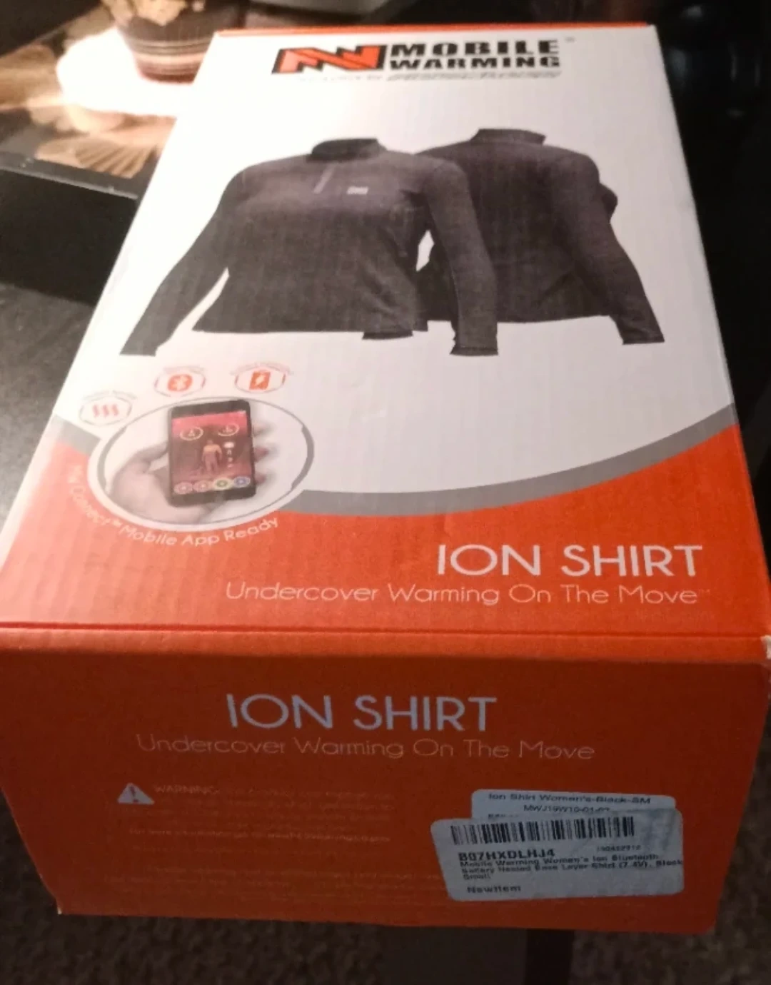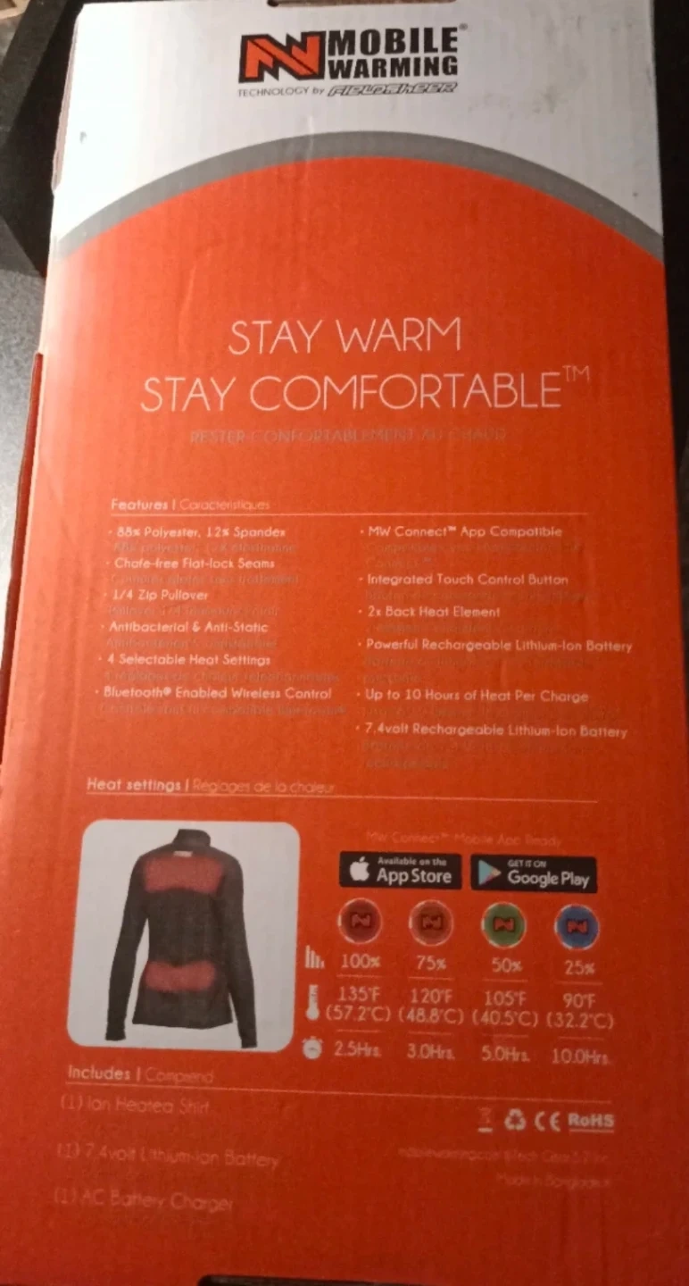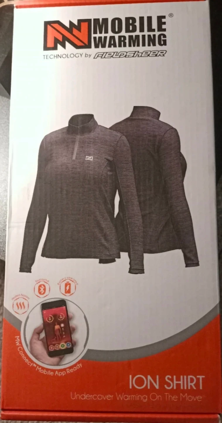 This is a Mobile Warming ION heated baselayer shirt. It's designed for undercover warming on the go. The shirt is 7.4 volt heated and app-ready for mobile control.