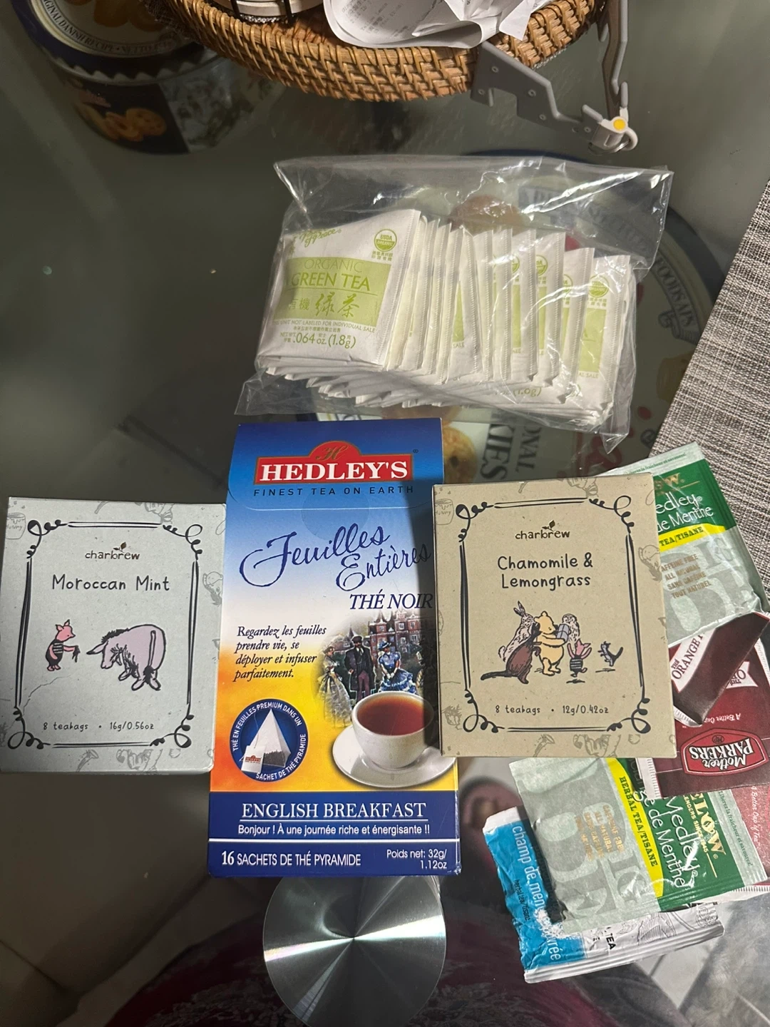 A selection of teas including Charbrew Moroccan Mint, Charbrew Chamomile & Lemongrass, Hedley's English Breakfast, and Organic Green Tea. This collection offers a variety of flavours for different tastes. Includes 8 teabags each of Moroccan Mint and Chamomile & Lemongrass, 16 pyramid sachets of English Breakfast, and a bag of Organic Green Tea teabags. Perfect for a relaxing tea break!