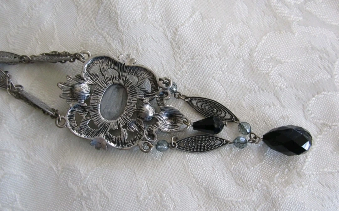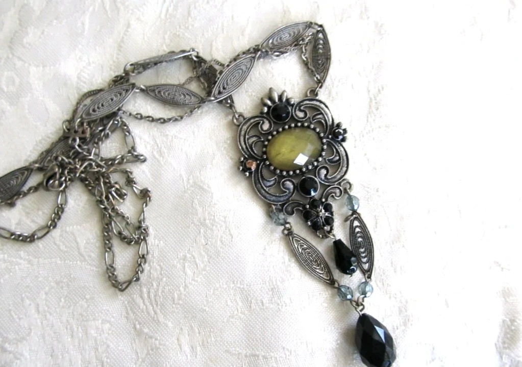 This statement necklace features an ornate silver-tone pendant with a large, faceted yellow stone. It's accented with black and grey beads and dangling charms. The detailed metalwork gives it a vintage feel. Perfect for adding flair to an outfit!