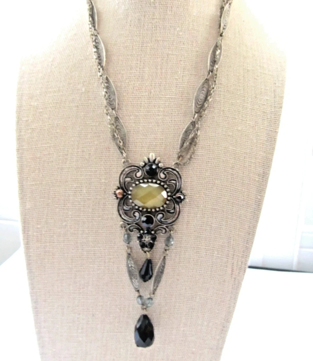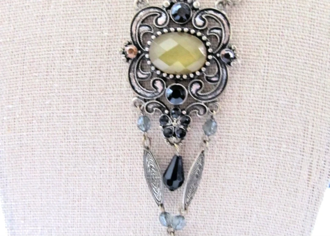 This statement necklace features an ornate silver-tone pendant with a large, faceted yellow stone. It's accented with black and grey beads and dangling charms. The detailed metalwork gives it a vintage feel. Perfect for adding flair to an outfit!