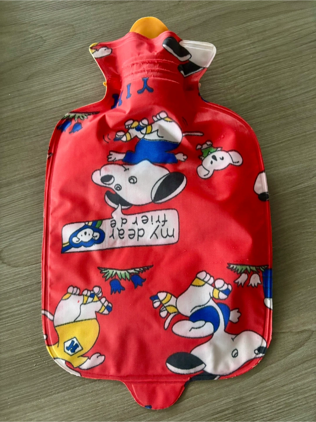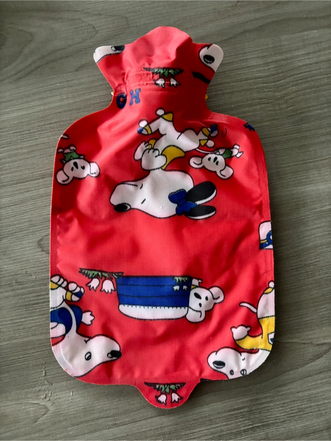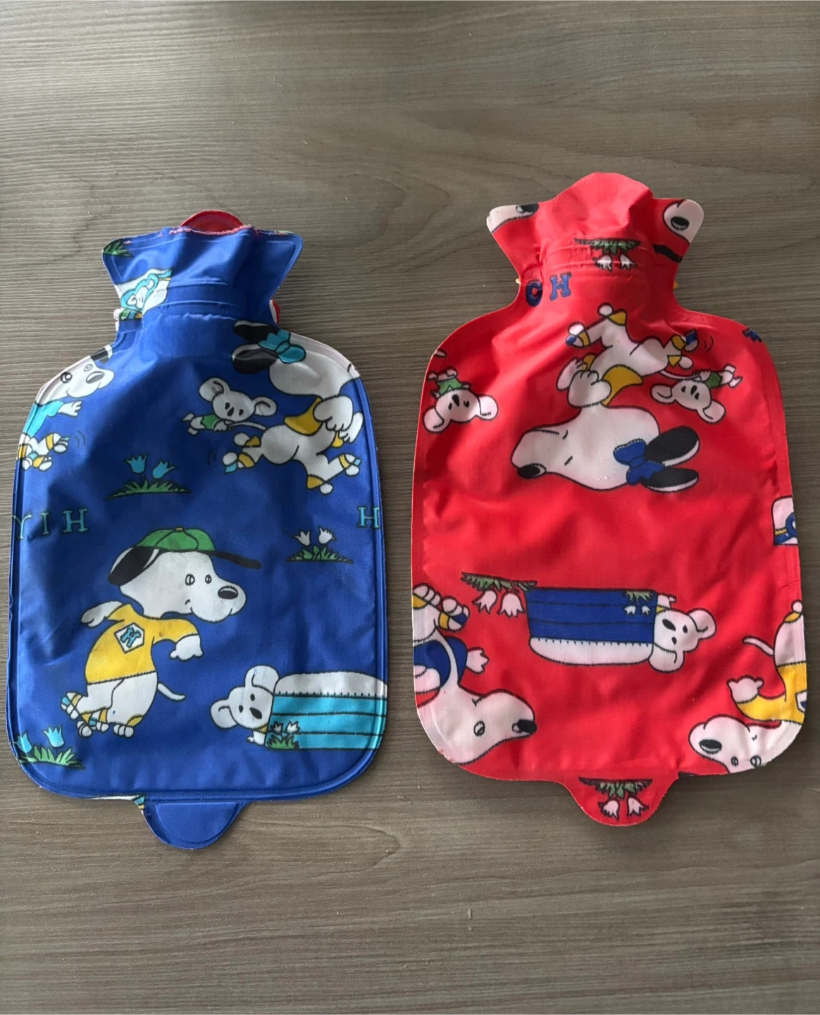 This set includes two cartoon-themed hot water bottles, one blue and one red. They're designed with playful dog characters. These bottles are great for soothing aches or keeping warm on chilly days.