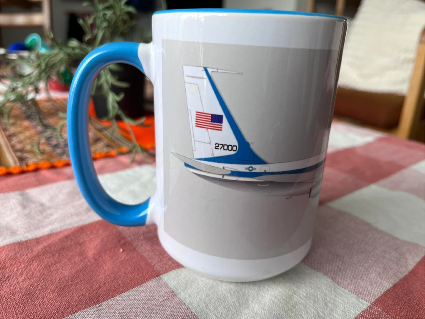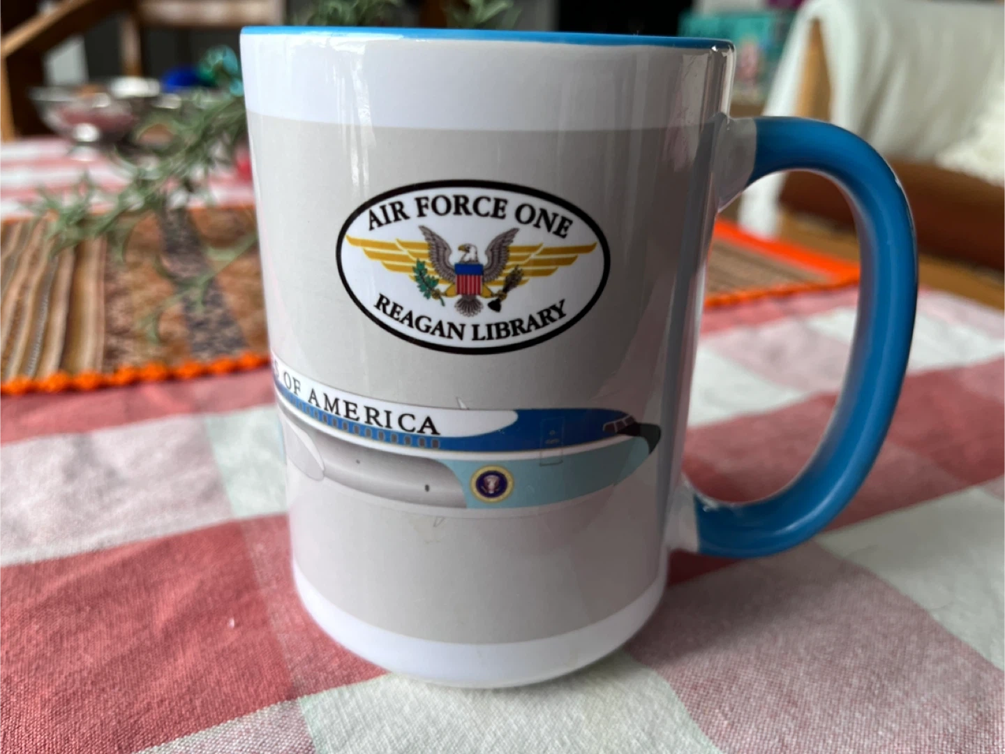 Showcasing a mug featuring Air Force One and the Reagan Library logo. The interior and handle are a vibrant blue colour. A great piece for collectors or anyone who appreciates aviation history!
