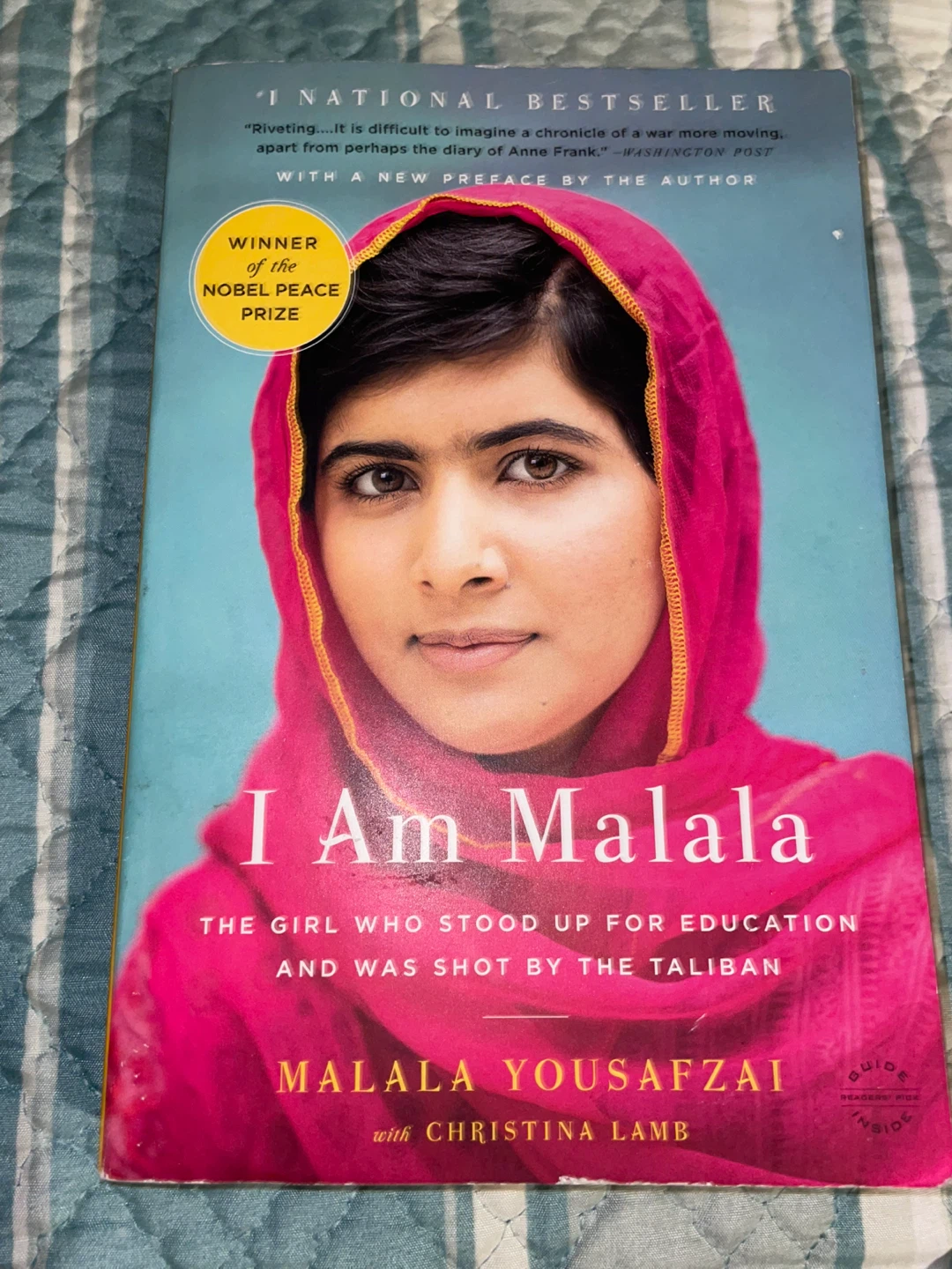 This is the "I Am Malala" book by Malala Yousafzai with Christina Lamb. It's a national bestseller and winner of the Nobel Peace Prize. This book tells the story of a young girl who stood up for education and was shot by the Taliban.