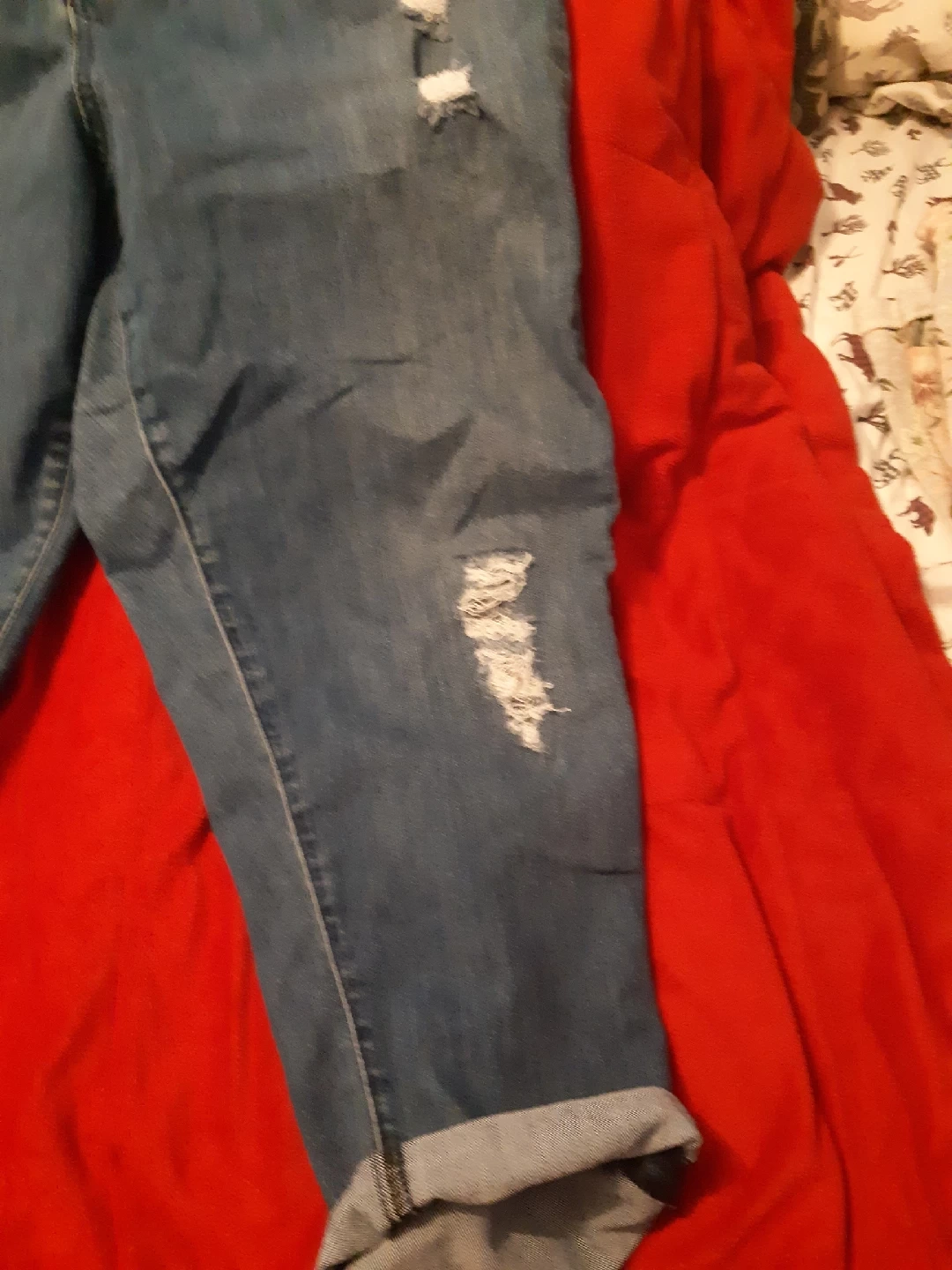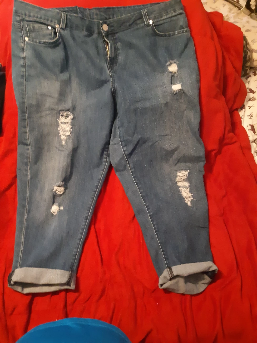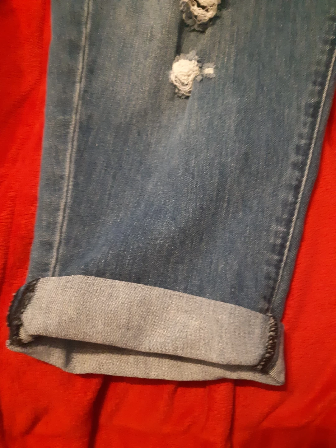 Selling a pair of MB1M denim jeans size 3. These jeans feature a distressed look with rips and rolled cuffs. They are made of 70% cotton, 28% polyester, and 2% elastane/spandex unrolled jeans are below ankle. so comfy.