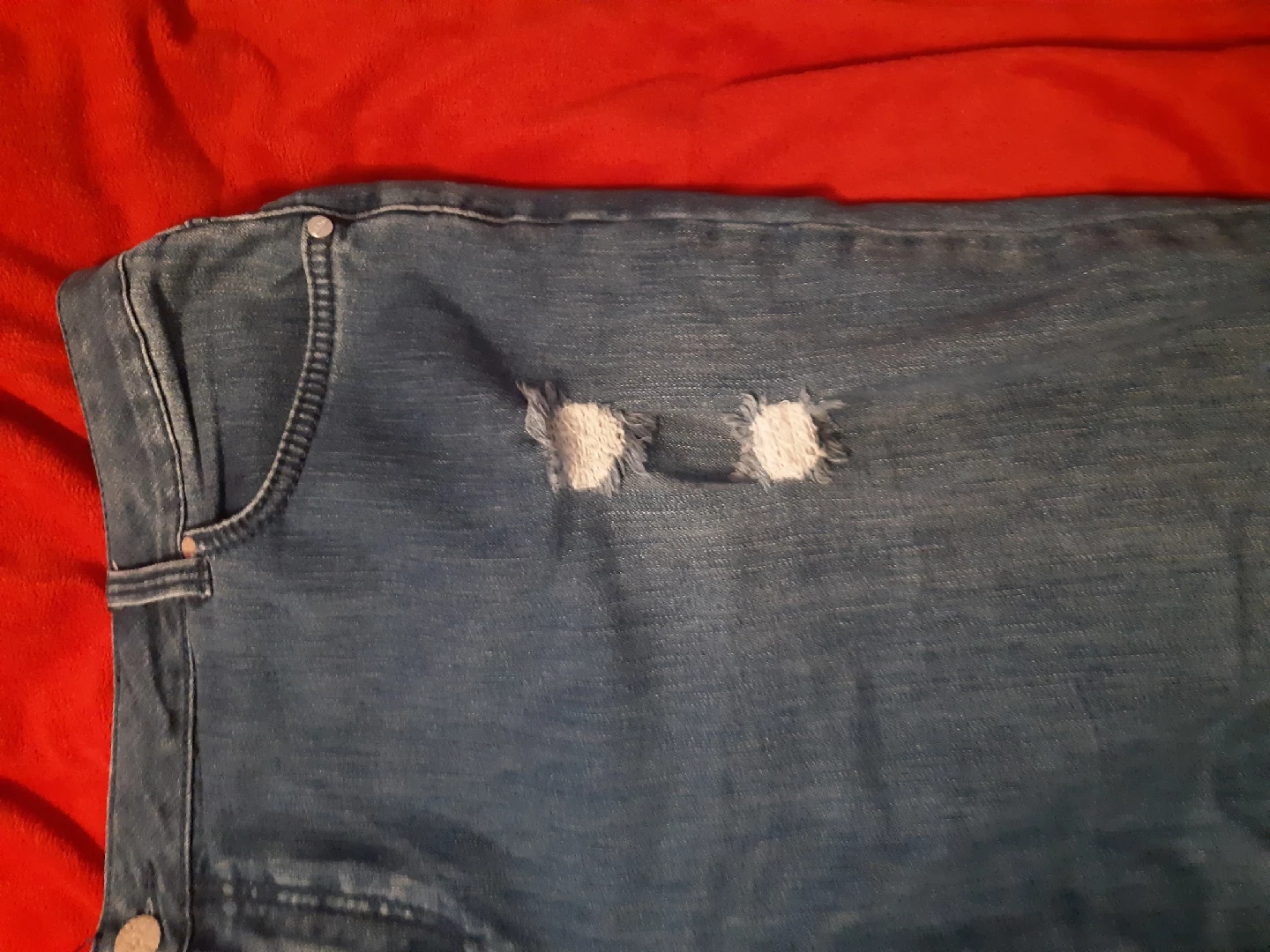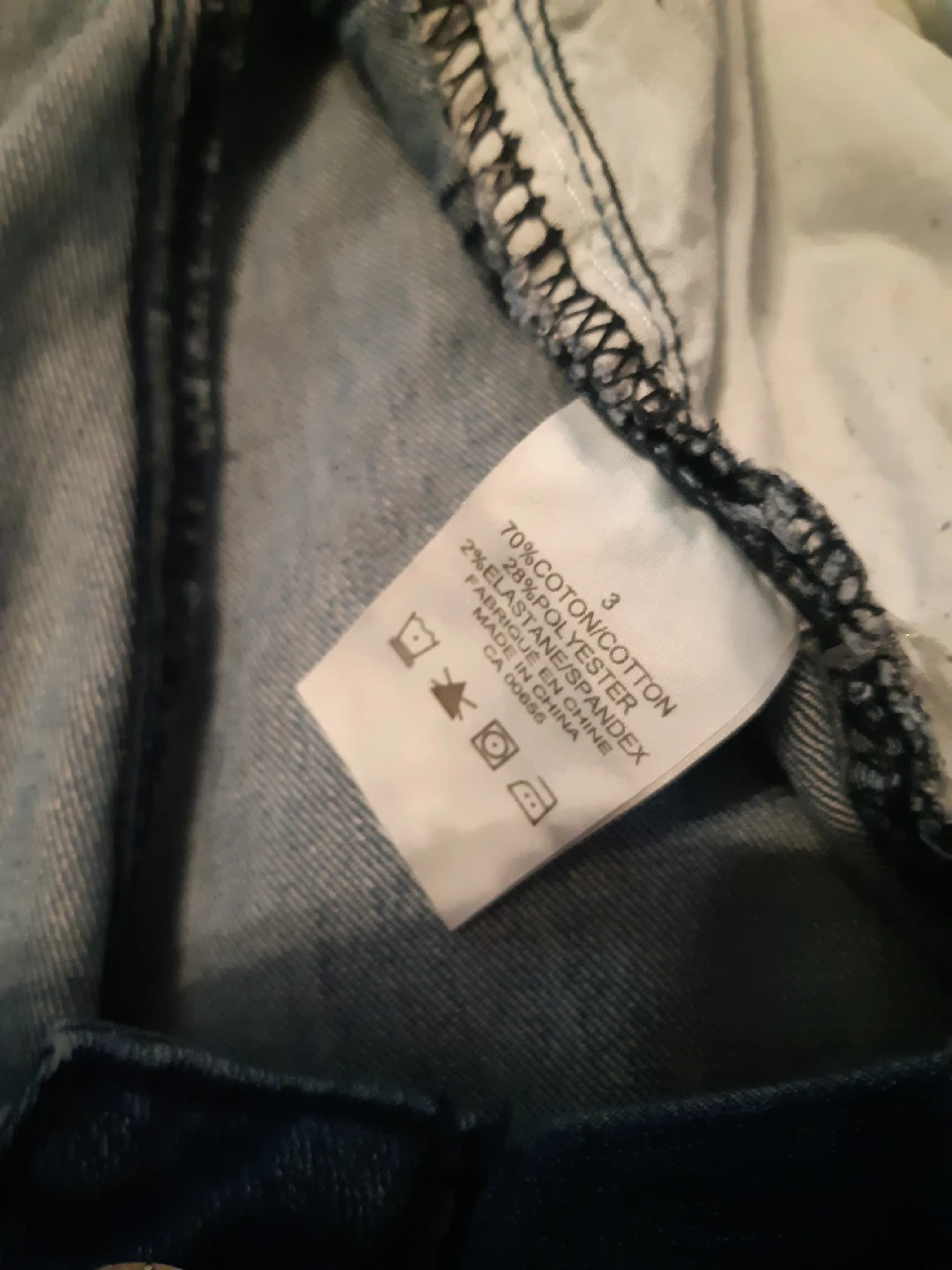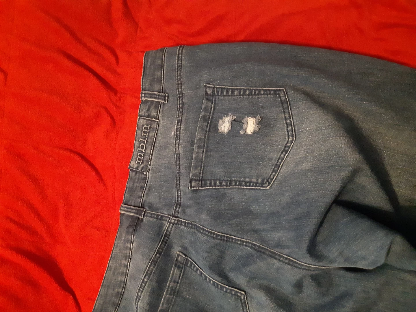 Selling a pair of MB1M denim jeans size 3. These jeans feature a distressed look with rips and rolled cuffs. They are made of 70% cotton, 28% polyester, and 2% elastane/spandex unrolled jeans are below ankle. so comfy.
