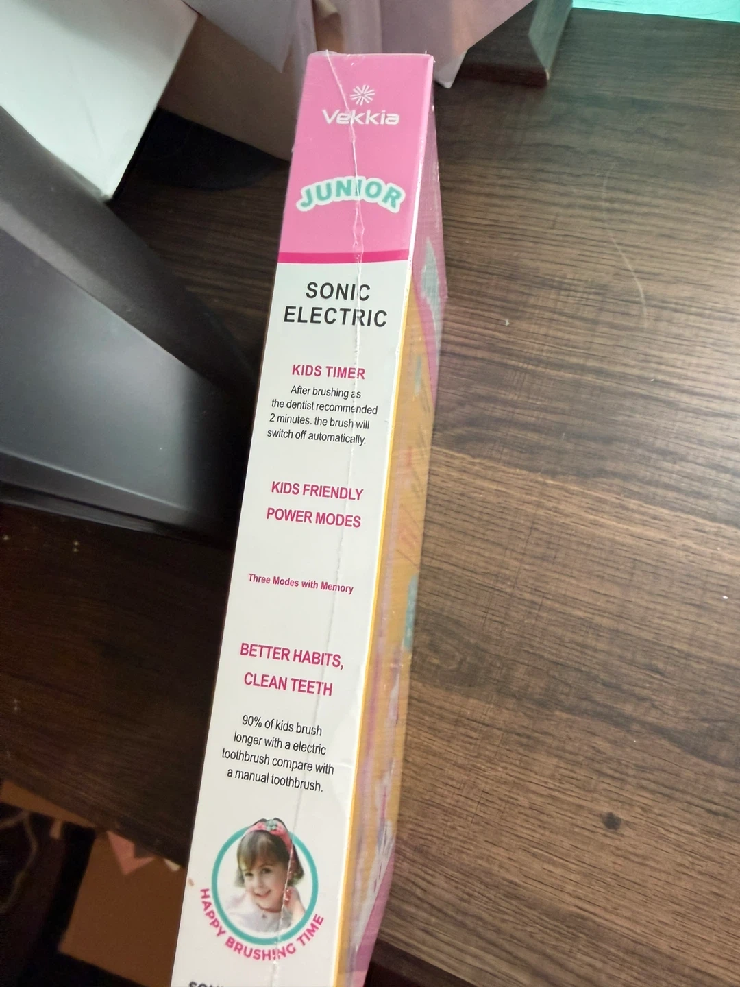 This is the Vekklia Junior Sonic Electric Toothbrush. It includes 4 replacement heads and features 3 modes with memory: Clean, Soft, and Massage. The toothbrush has a smart timer to encourage longer brushing. It's designed to help children develop better brushing habits.