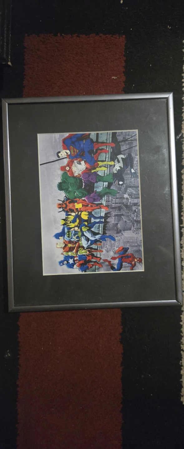 2 - "Superheroes on a skyscraper" is a mixture of marvel and DC characters. I think it's licensed art because this image in easily available in posters and shirts. This one is a framed lithograph on a 8×6 canvas board, originating from an auction house in Vancouver.