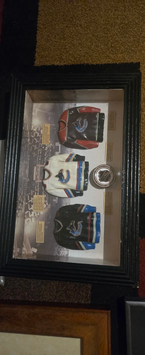 Shadow box featuring three Vancouver Canucks jerseys and a puck. Great for any Canucks fan!. Obo