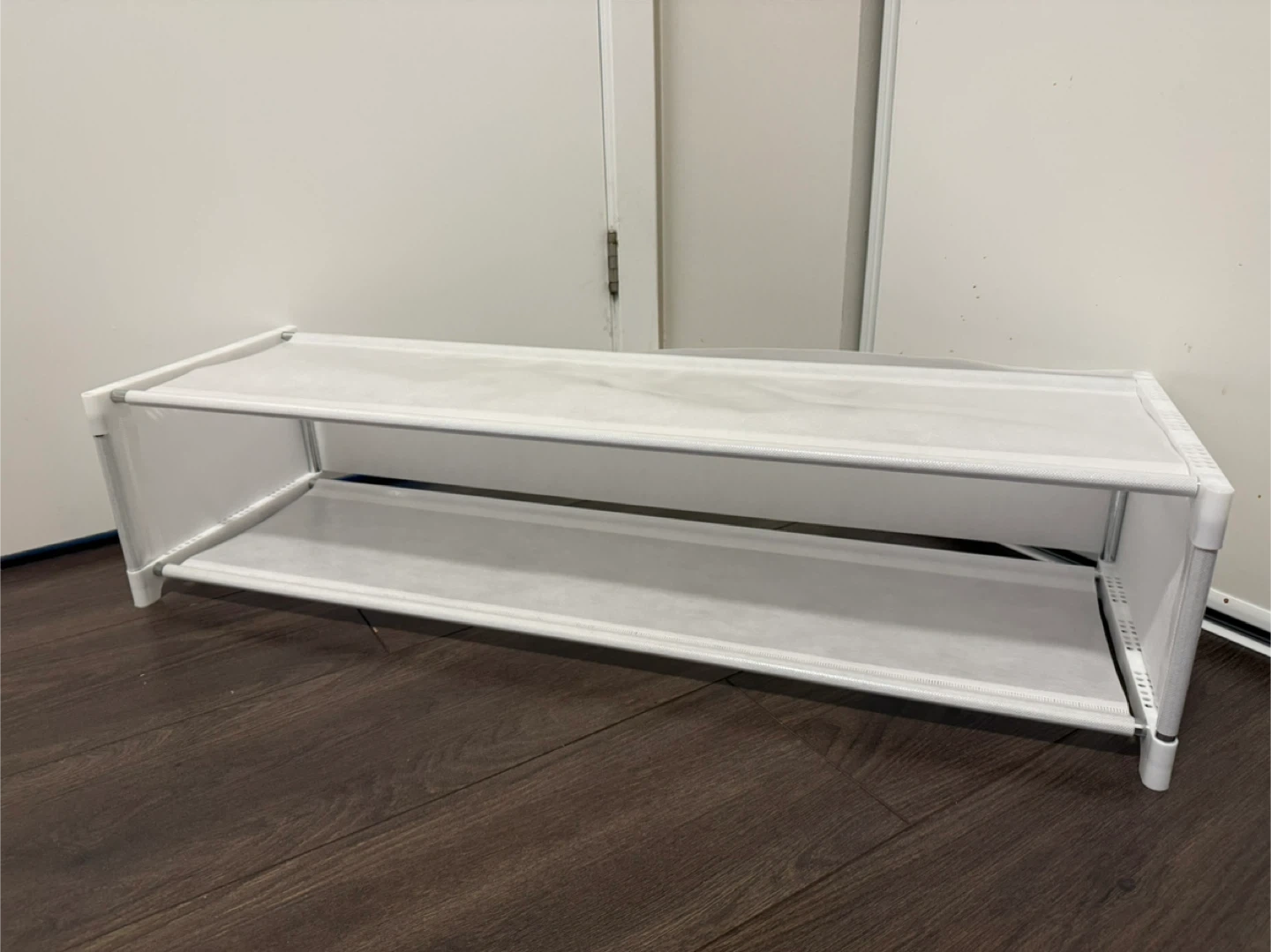 This is a simple white 2-tier shoe rack. It's made with a metal frame and fabric shelves. It's useful for organizing shoes by the door or in a closet. This rack is lightweight and easy to move.