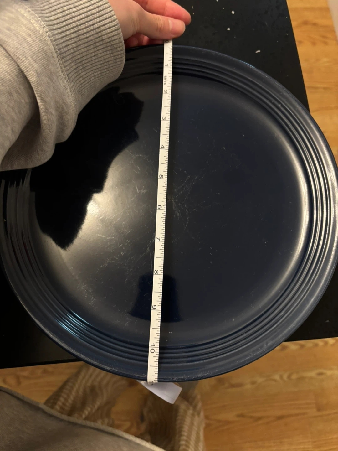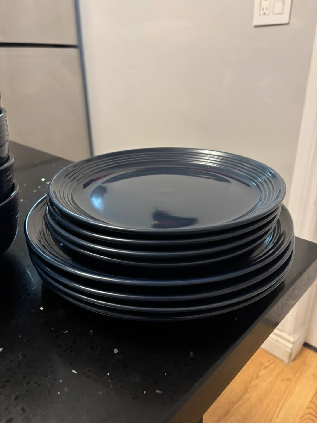 A set of eight navy blue plates and matching bowls. The plates measure approximately 9 inches , 11inches diameter and the bowls are about 6 inches in diameter. This dinnerware set is great for everyday use or special occasions!