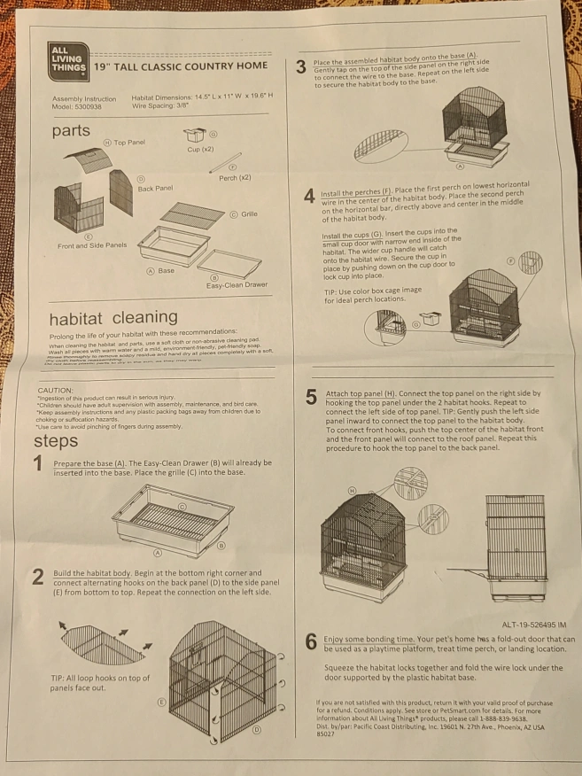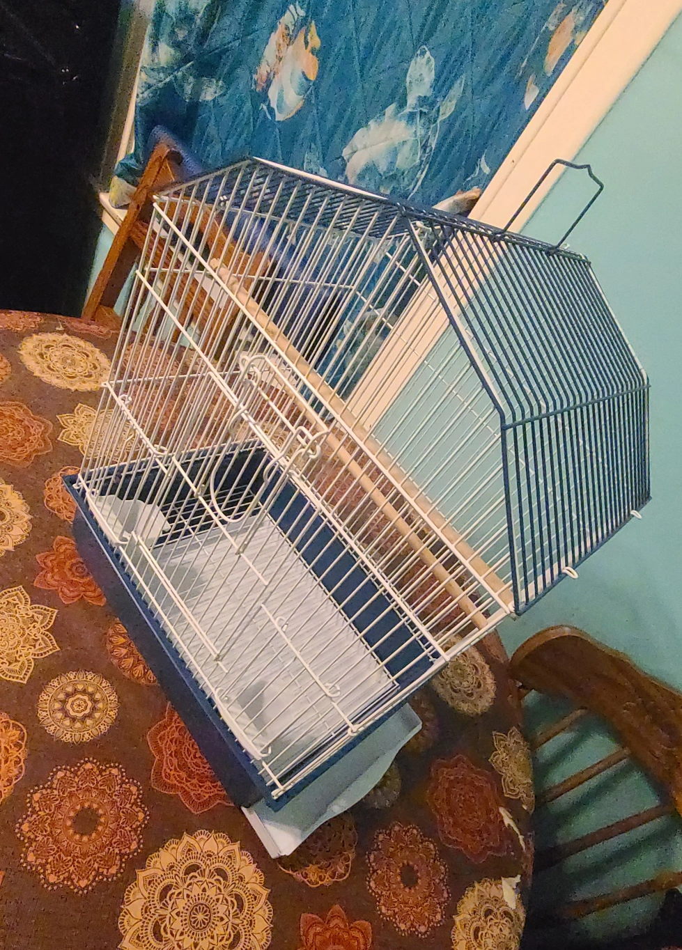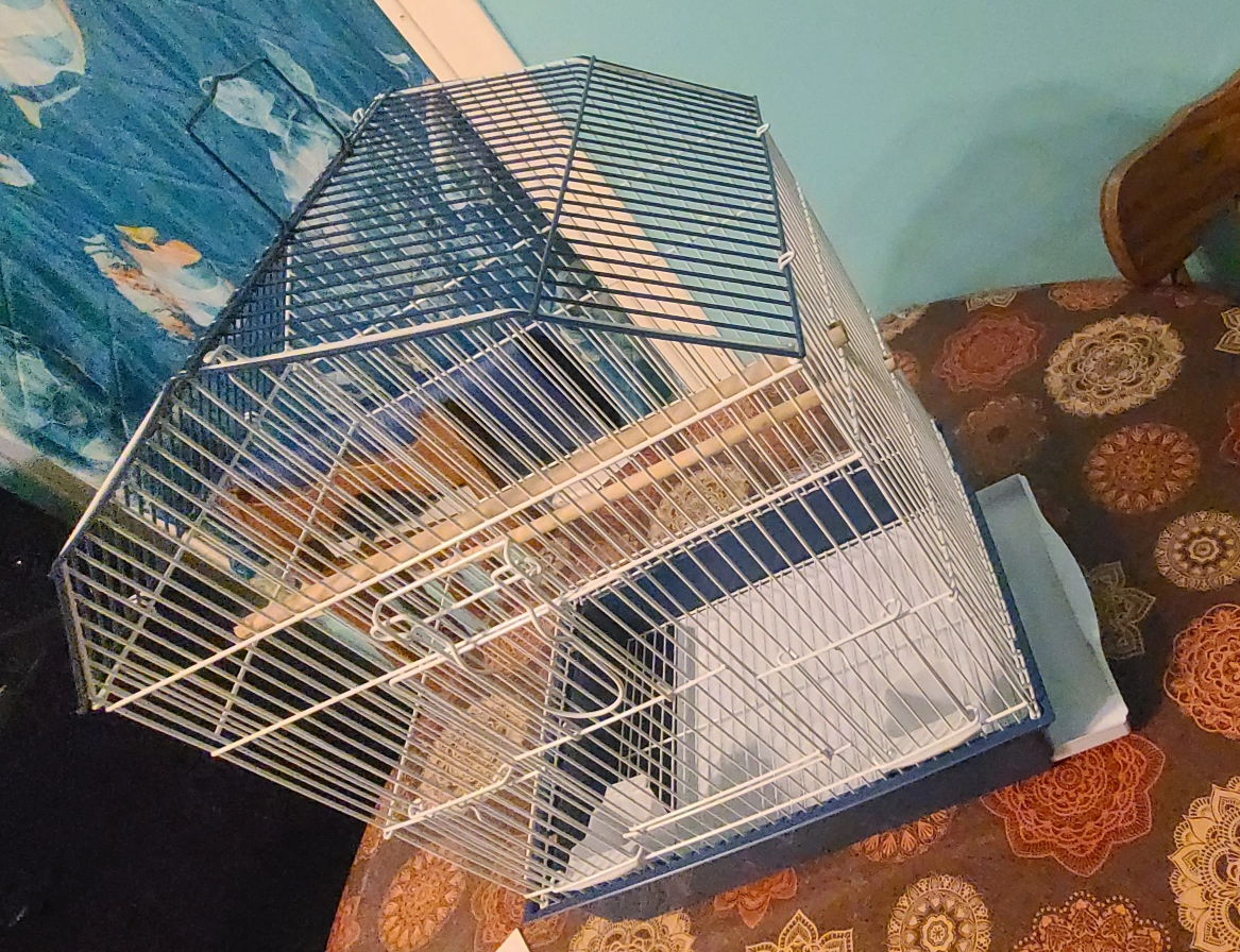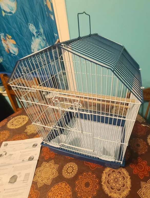 Small bird cage. Blue and white metal. Includes one wooden perch. Easy clean drawer. Assembly instructions included.