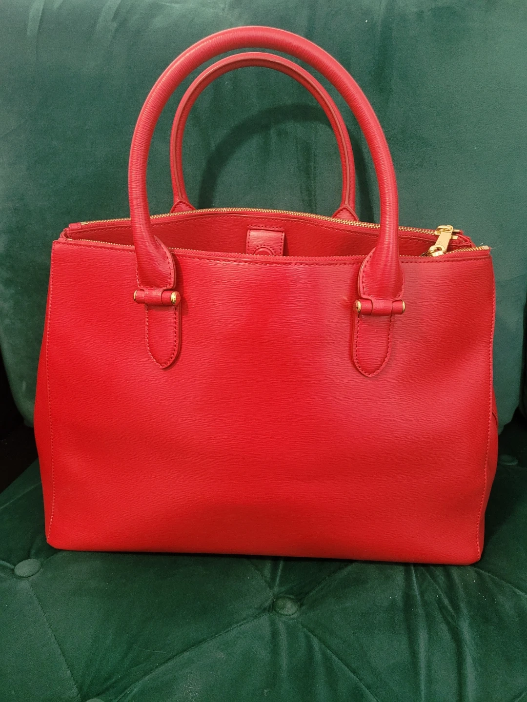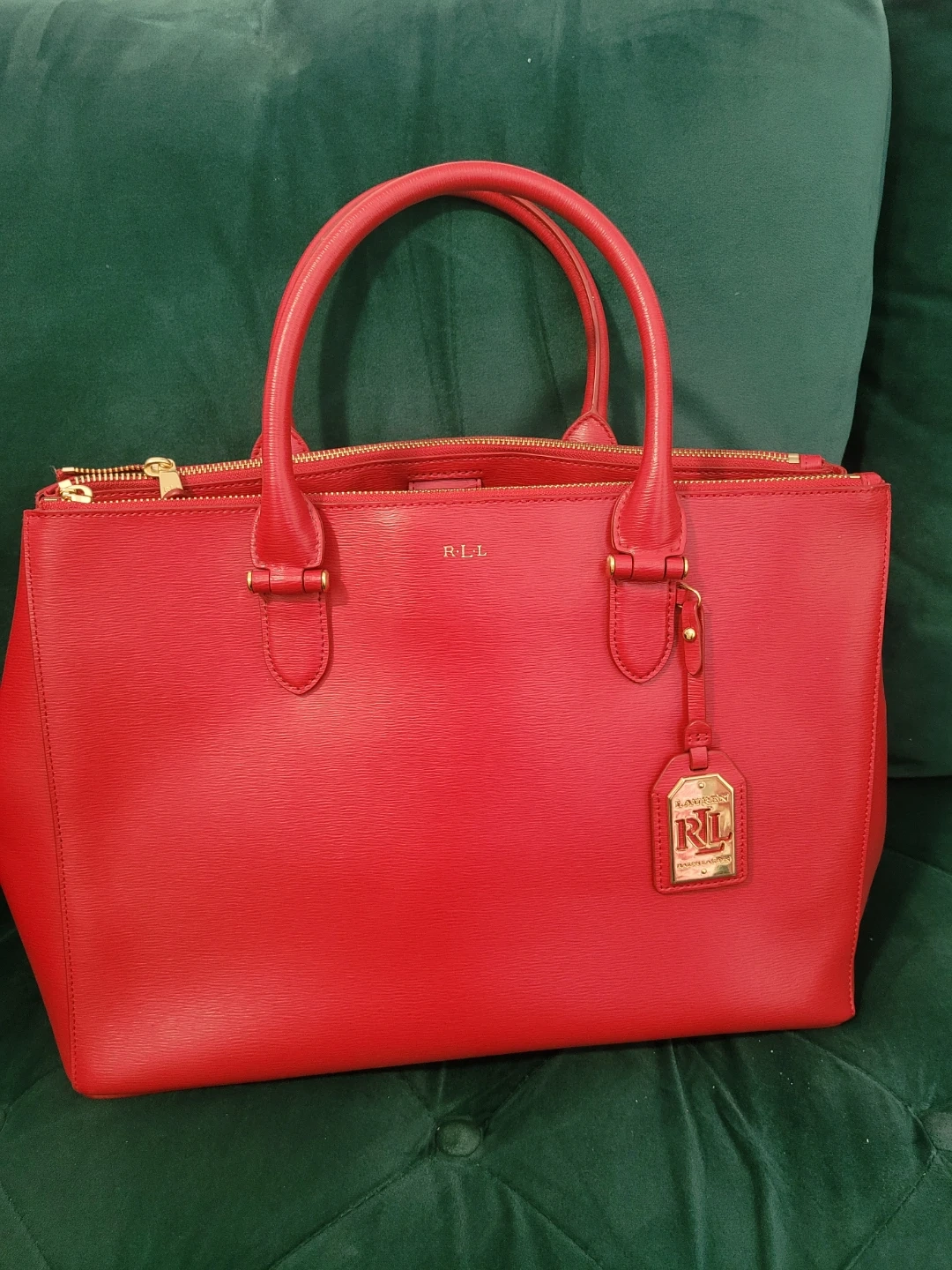 This Lauren Ralph Lauren tote is made from red leather. It features a zip closure and a convenient top-handle design. A great bag for everyday use!