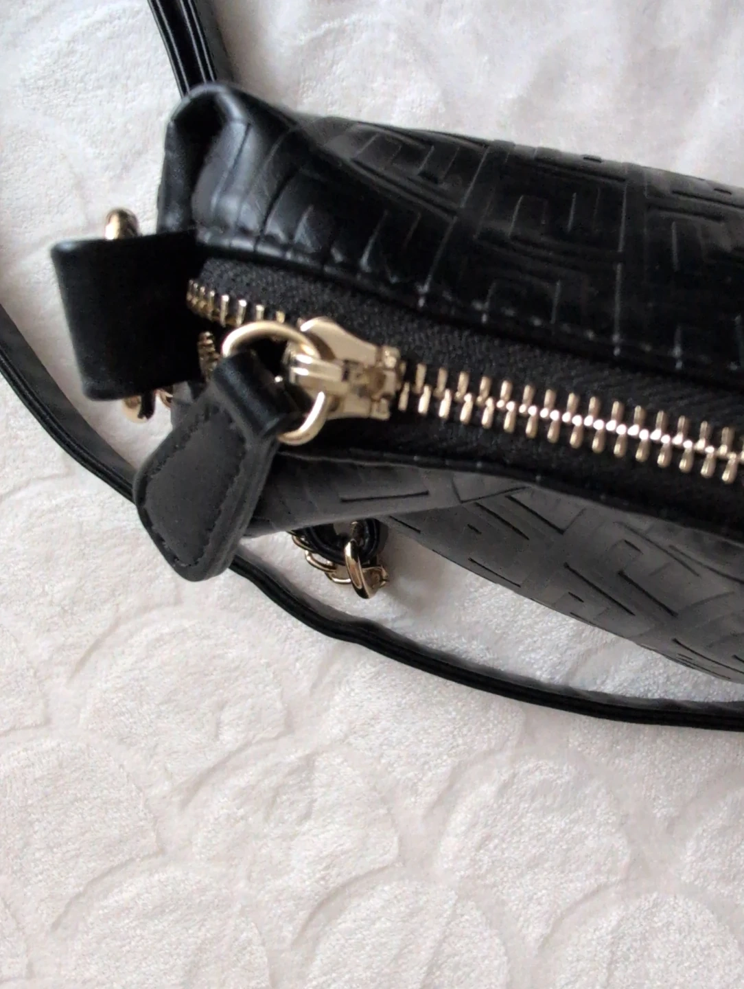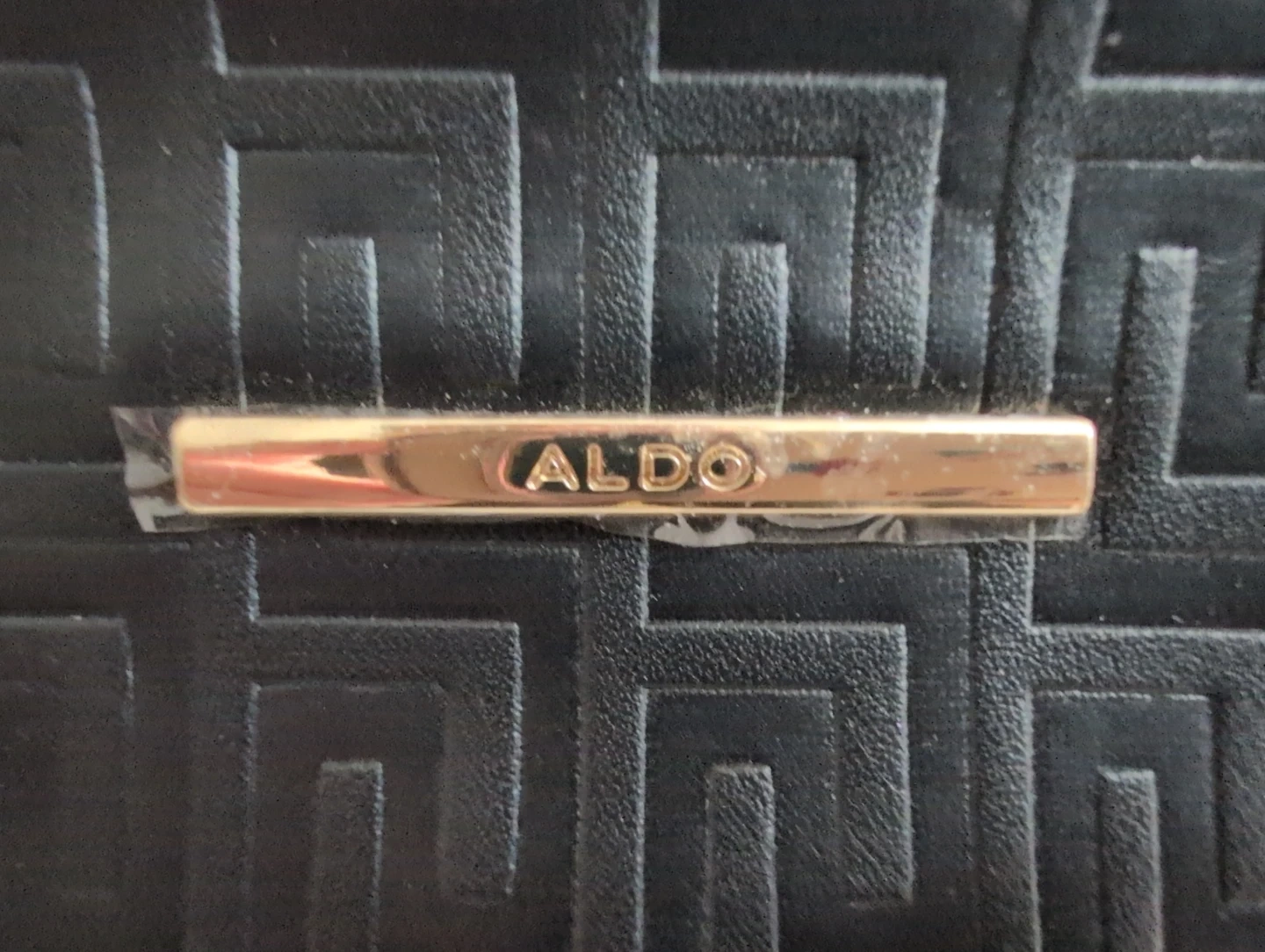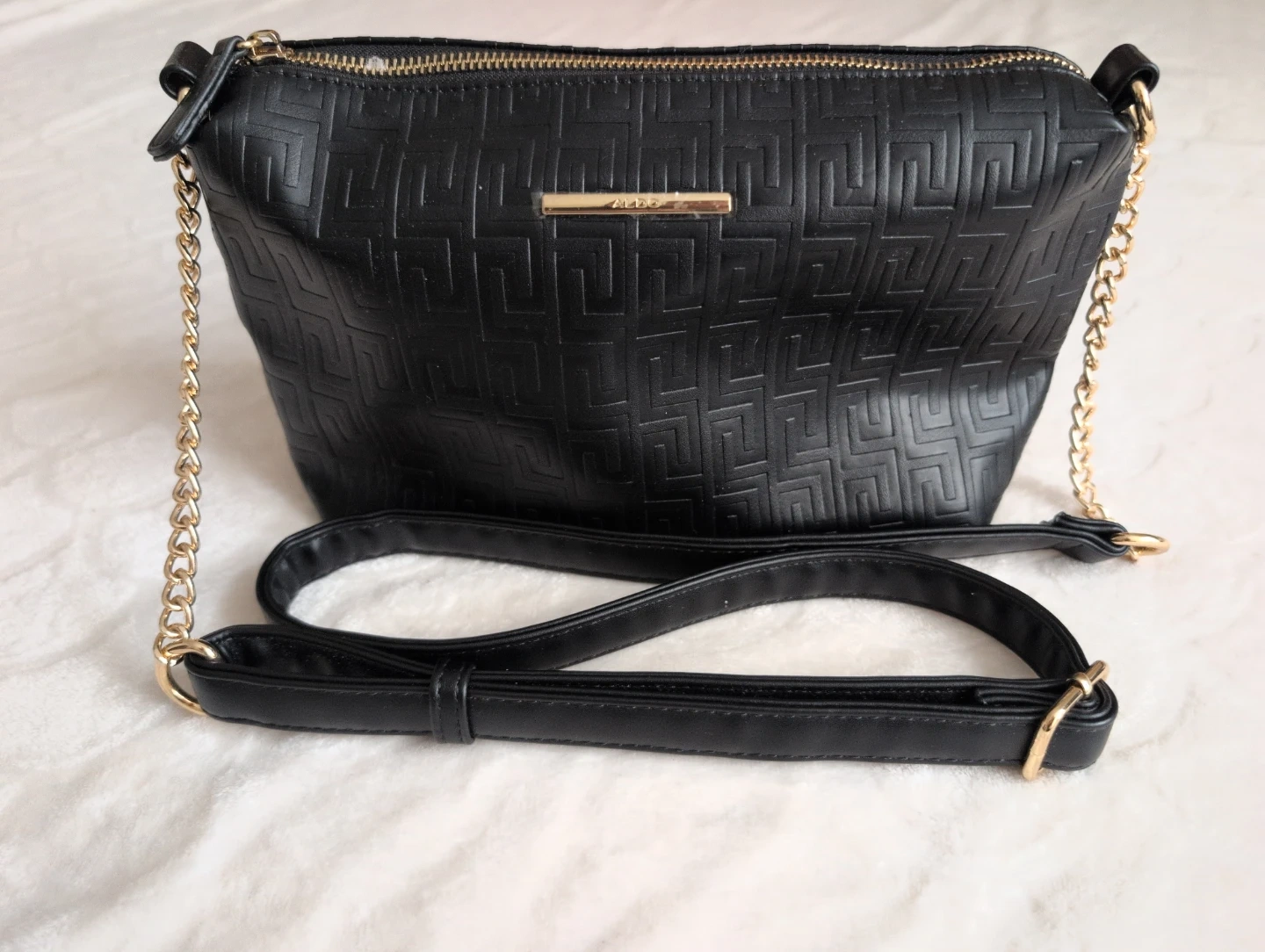 Stylish black crossbody bag from ALDO. It's made of faux leather with a geometric embossed pattern and gold-tone hardware. Includes a removable shoulder strap and a secure zipper closure. This bag is perfect for everyday use or a night out!
