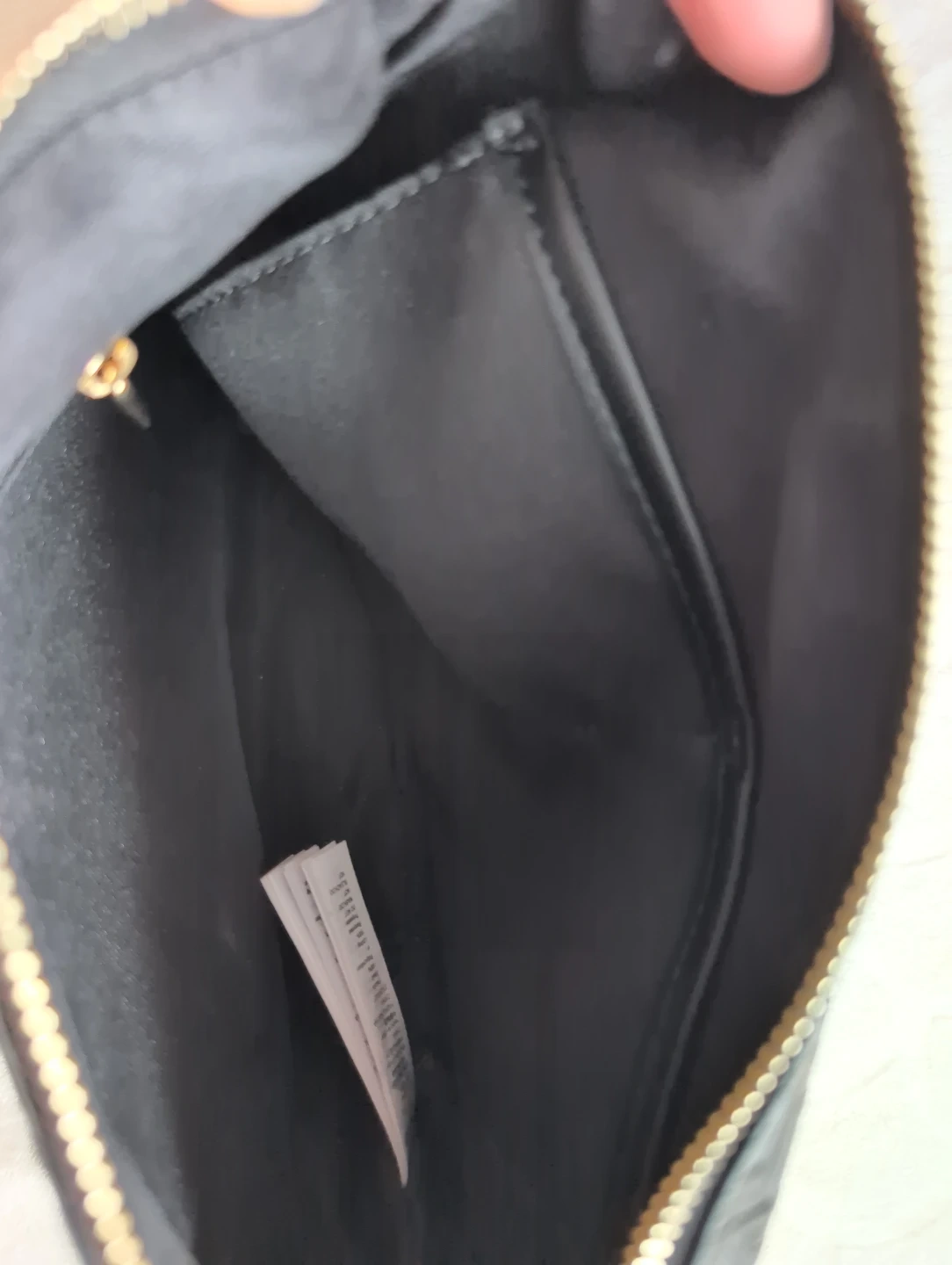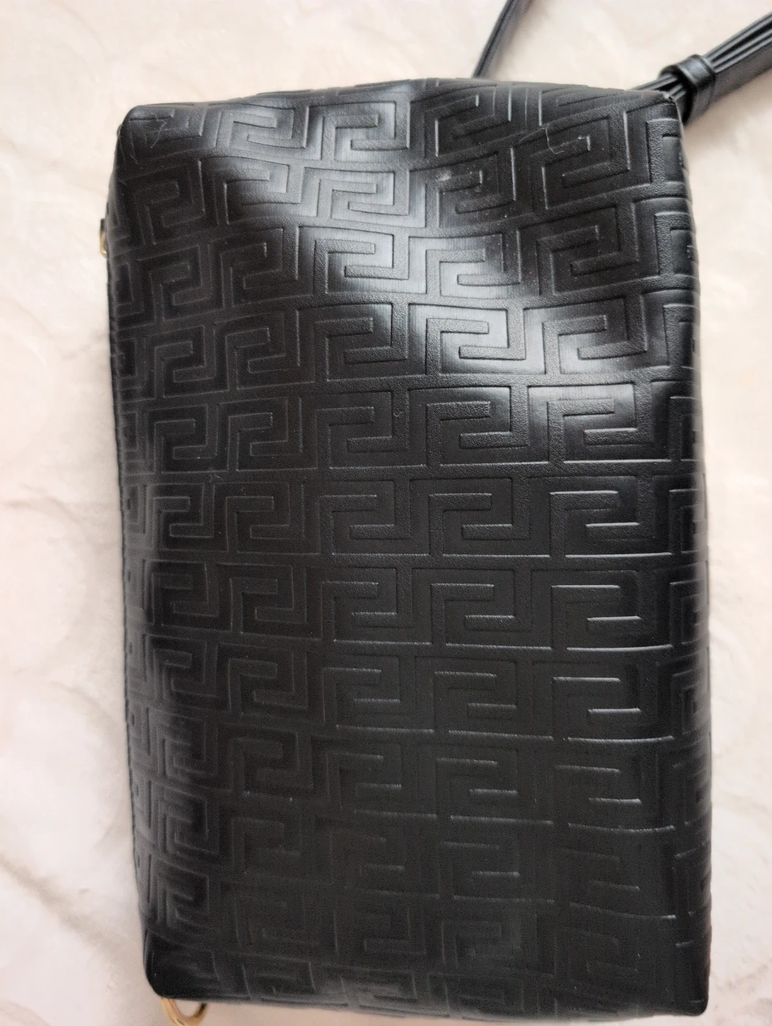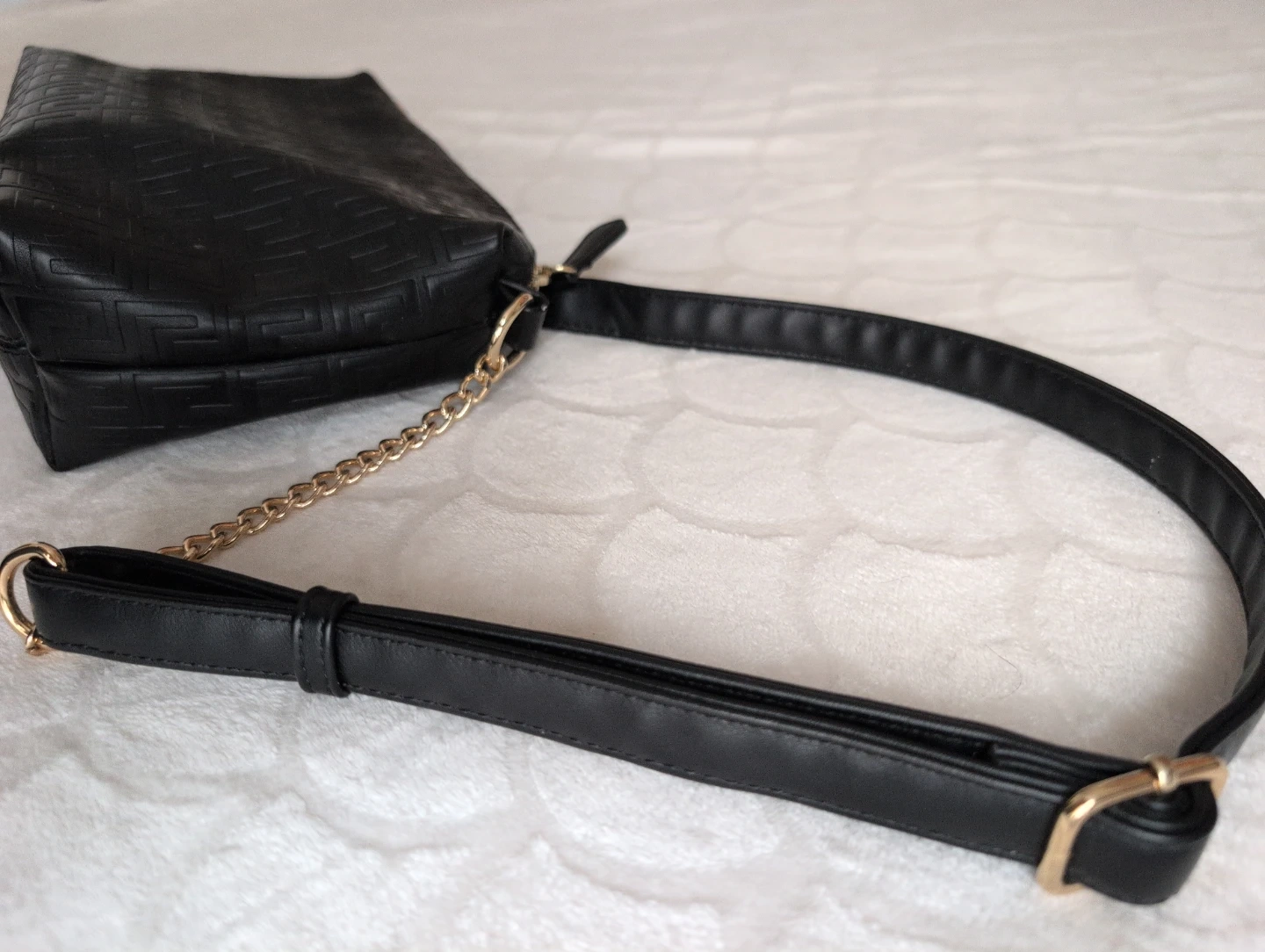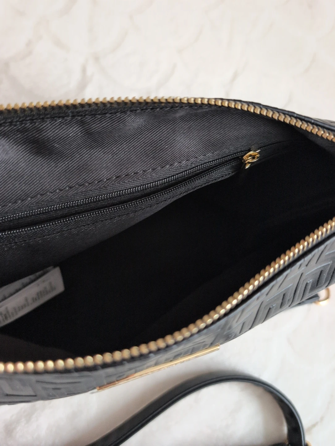 Stylish black crossbody bag from ALDO. It's made of faux leather with a geometric embossed pattern and gold-tone hardware. Includes a removable shoulder strap and a secure zipper closure. This bag is perfect for everyday use or a night out!