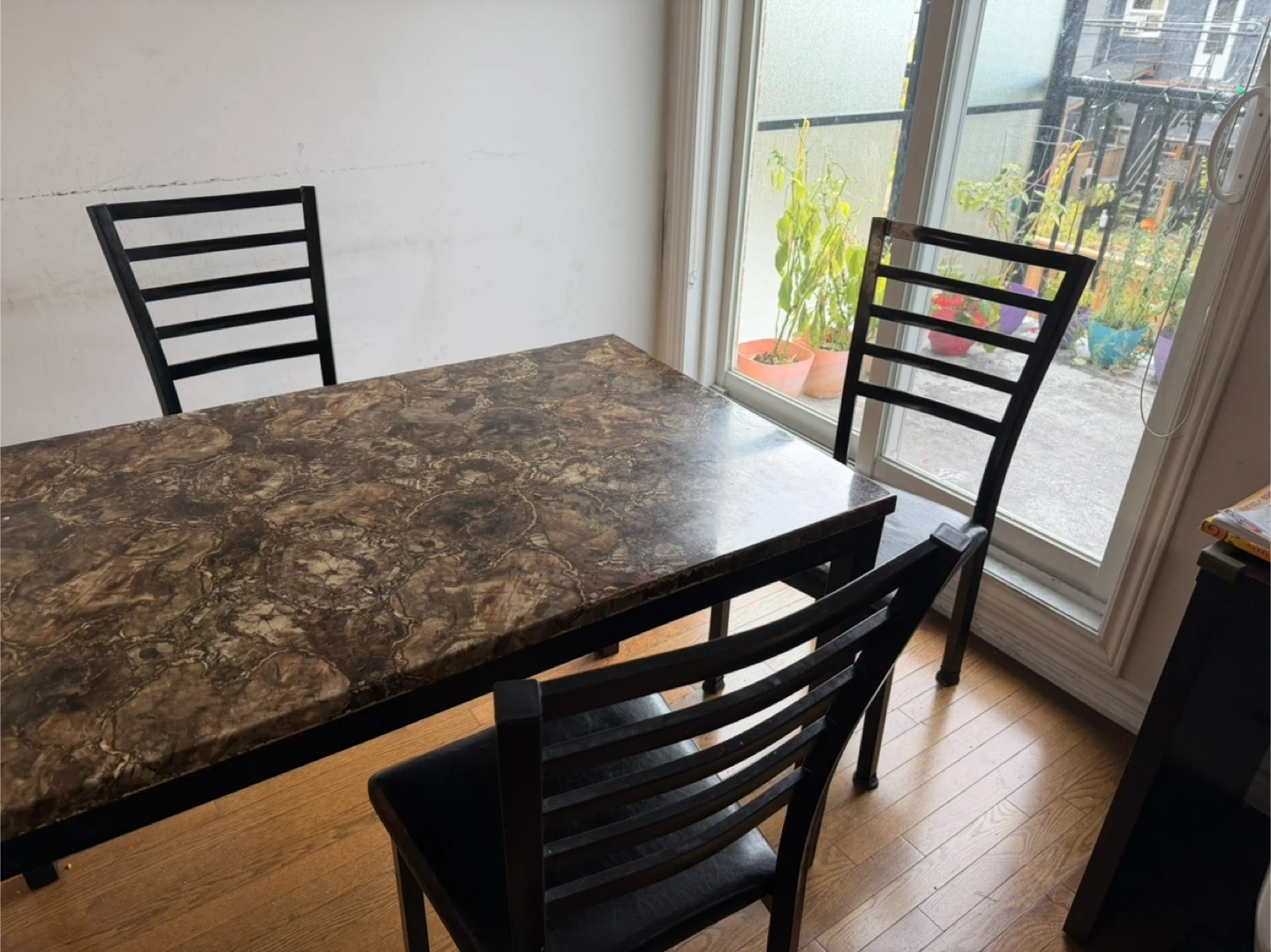 Dining table with matching chairs in great working condition. The table has a stylish dark top that’s easy to clean and scratch-resistant, paired with sturdy black metal legs. Chairs are comfortable with ladder-back design and cushioned seats. Perfect for kitchen, apartment, rental unit, or family dining area. Neutral dark tones match most interiors.