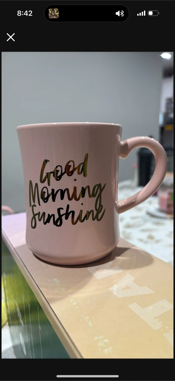 A cute pink mug with "Good Morning sunshine" written on it in gold lettering! It's perfect for your morning coffee or tea