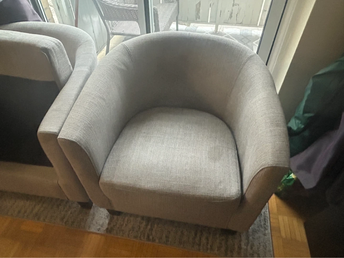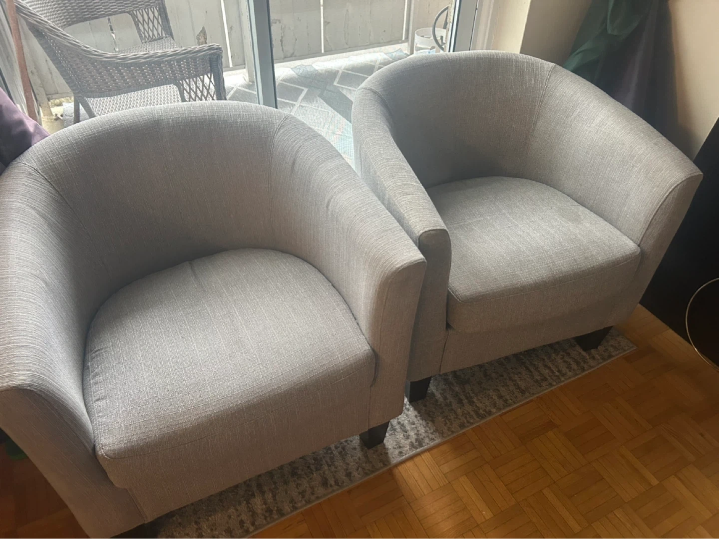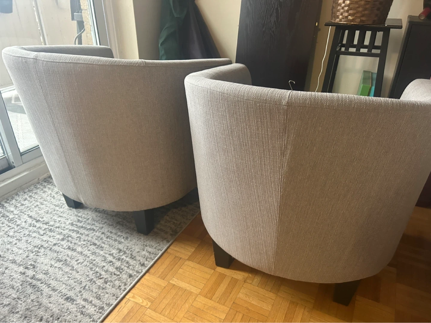 A set of two barrel-style accent chairs in a light grey textured fabric. Bought from Leon’s a year and a half ago for $180 for the pair. No longer match our decorations so the reason for selling. There a curved back and have sturdy dark wooden legs. One seat has a little mark on it (see picture) it’s from concentrated washing soap that leaked out of a bag of groceries we put on the chair, we’ll give it another clean again before purchase. We don’t have pets so no scratches or hairs and we have never smoked so it won’t smell like an ash tray!