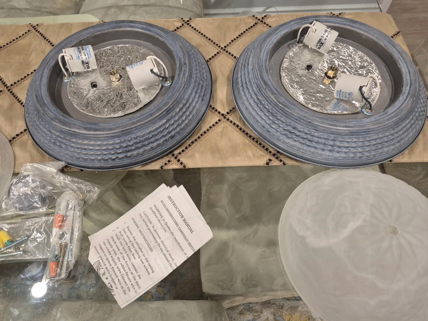 Selling a set of two ceiling light fixtures. They feature a unique design with a textured blue-grey base and a frosted glass dome. All the necessary hardware and an instruction manual are included! Misplaced the screws of one. Both for $15. Major intersection Brittania and 10th Line in Mississauga
