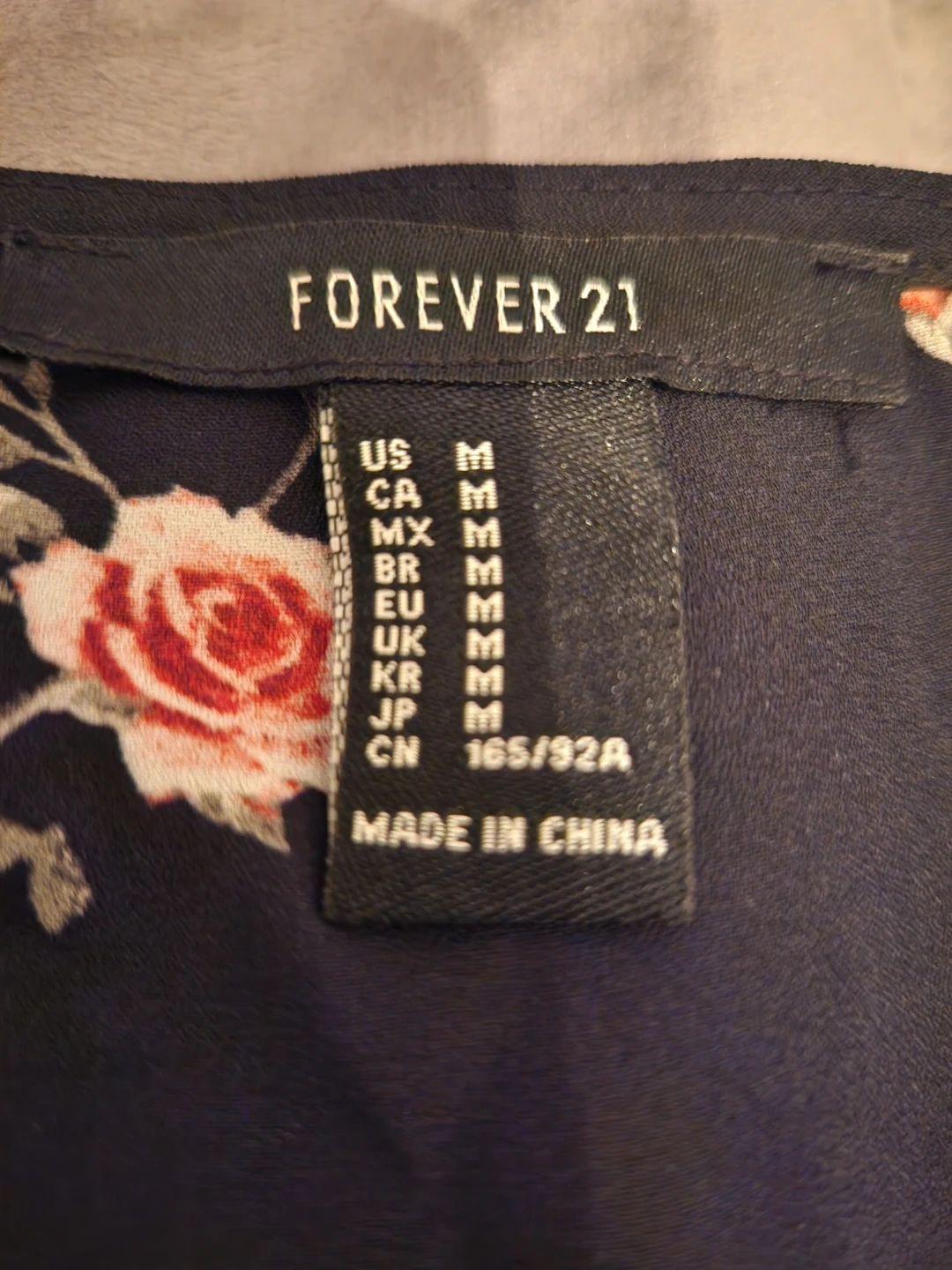 This black floral print kimono cardigan from Forever 21 features a lightweight, flowy design with ruffled edges. It's a size medium and made in China. Perfect for layering over outfits! If you interested chat with me and I'll give you the meeting spot/my address.