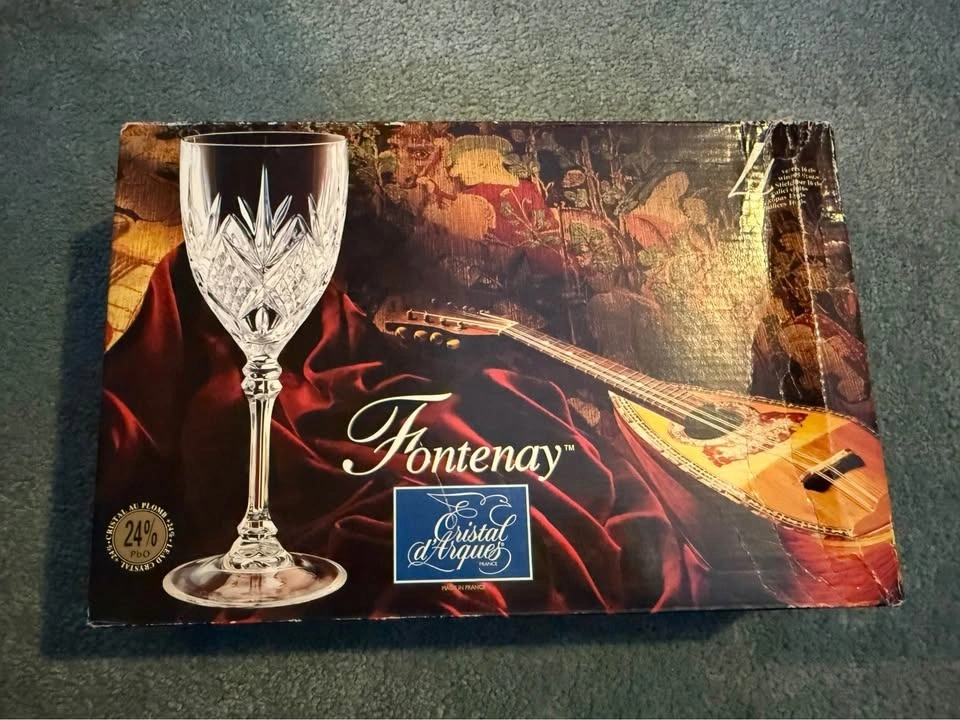 Cristal d'Arques-Durand Fontenay crystal glasses. The glasses feature a distinctive crisscross and fan cut pattern. They are made of 24% lead crystal. The Fontenay pattern was discontinued in 1995.