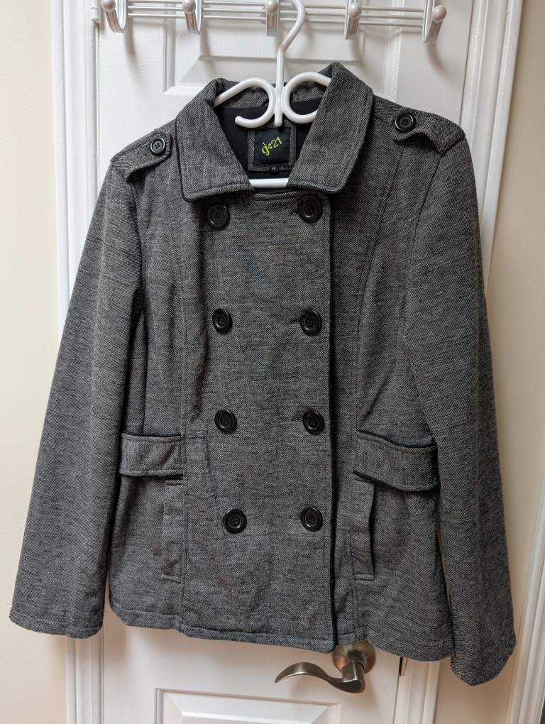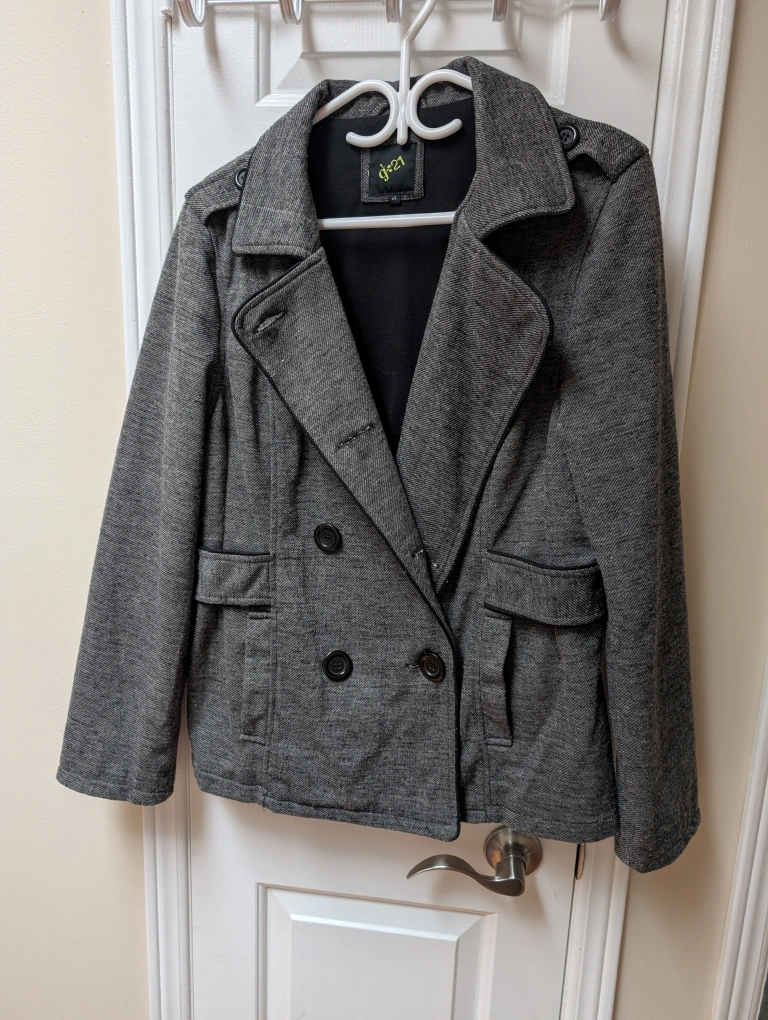 Women's grey peacoat. Double-breasted design. Features black buttons and subtle black trim. Good for fall or spring.