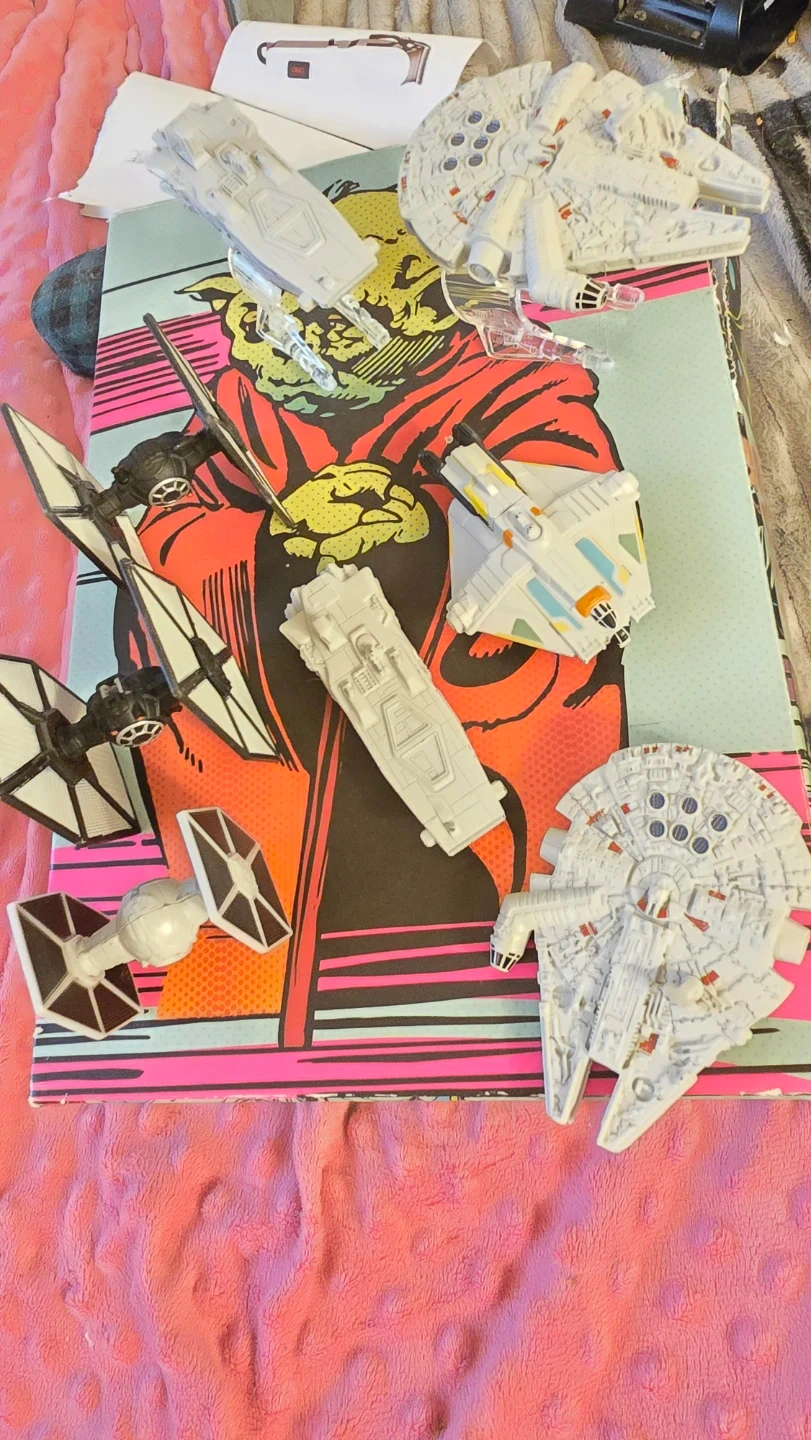 Collection of Star Wars die-cast vehicles, including Millennium Falcon and TIE Fighters. Displayed on a Star Wars themed box. Great for any fan's collection!