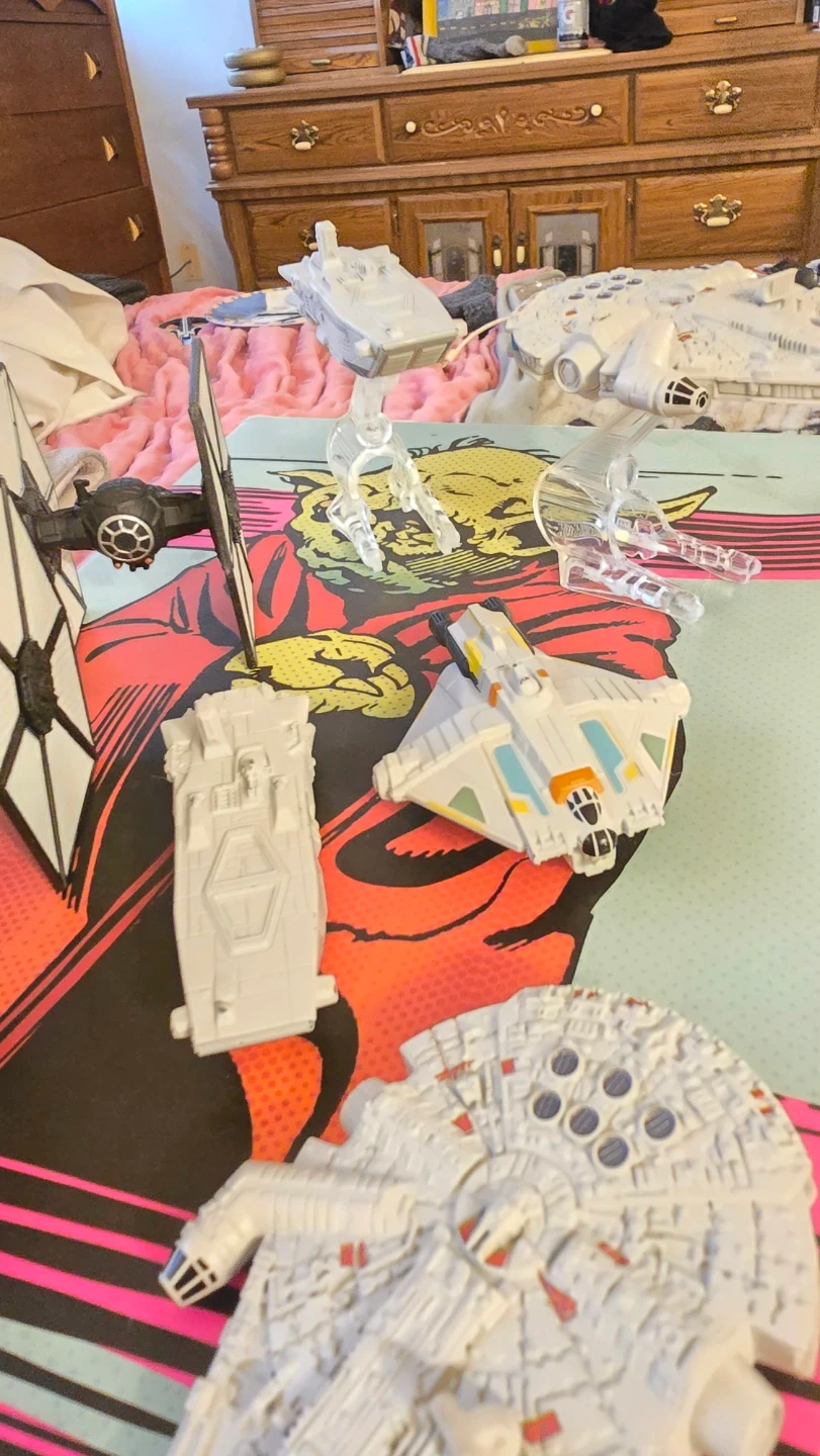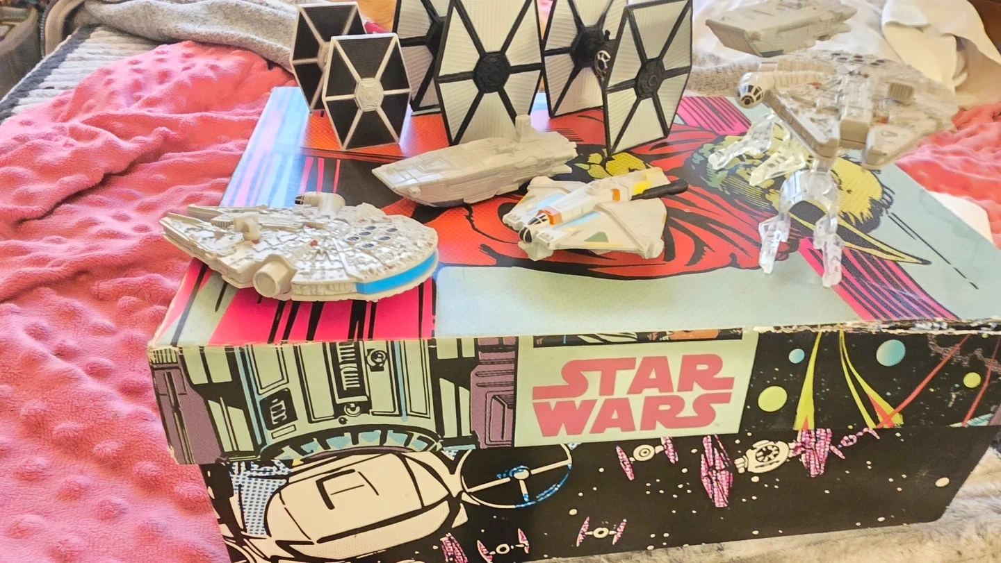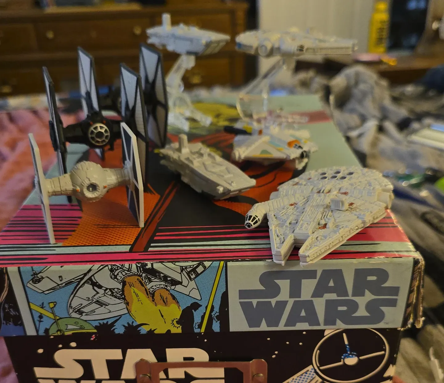 Collection of Star Wars die-cast vehicles, including Millennium Falcon and TIE Fighters. Displayed on a Star Wars themed box. Great for any fan's collection!
