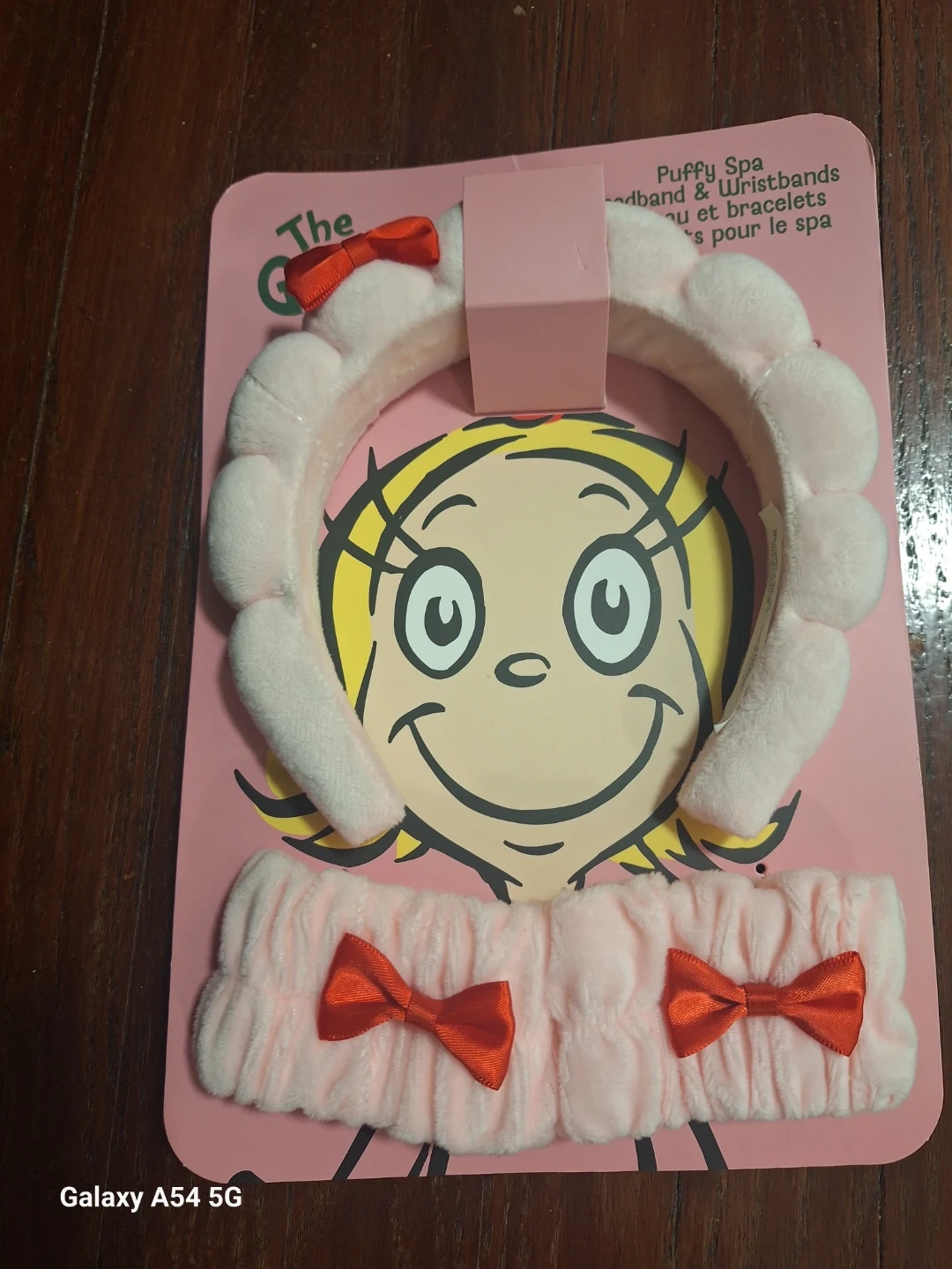 This set includes a fluffy spa headband and wristbands featuring The Grinch. Both are made from 100% polyester. They're perfect for keeping hair back during skincare routines.