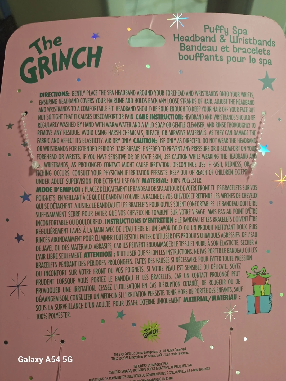 This set includes a fluffy spa headband and wristbands featuring The Grinch. Both are made from 100% polyester. They're perfect for keeping hair back during skincare routines.