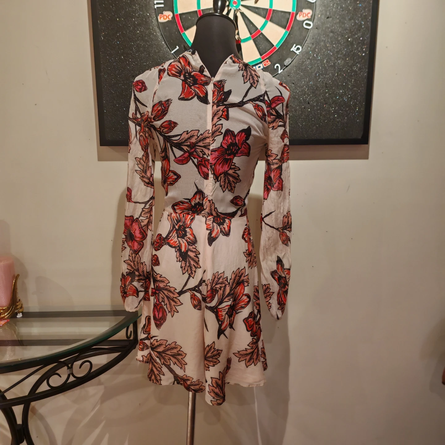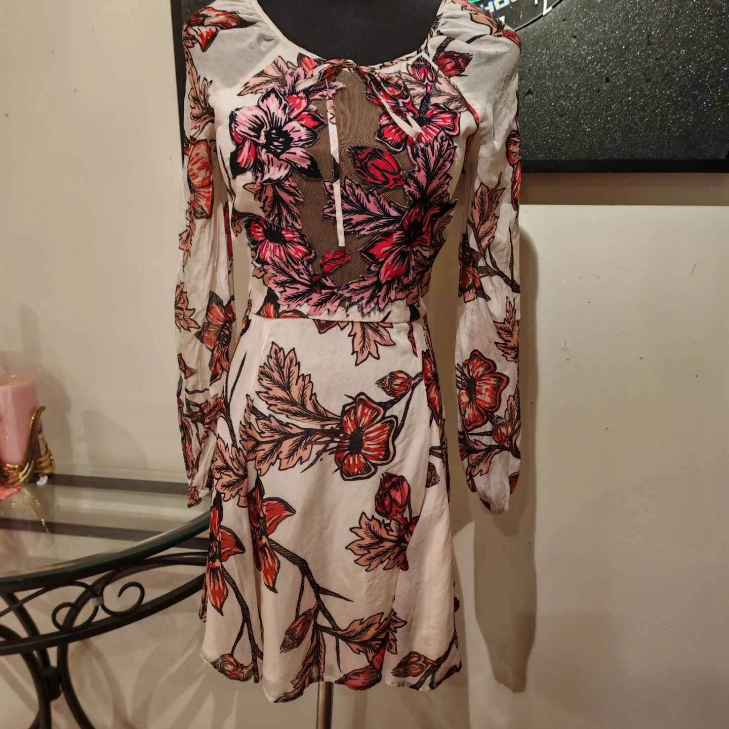 This is a For Love & Lemons dress, size extra small, perfect for a special occasion! This long sleeve, floral mini dress is in good condition and is made of silk, rayon, nylon and spandex. It has a unique and beautiful design that is sure to turn heads.