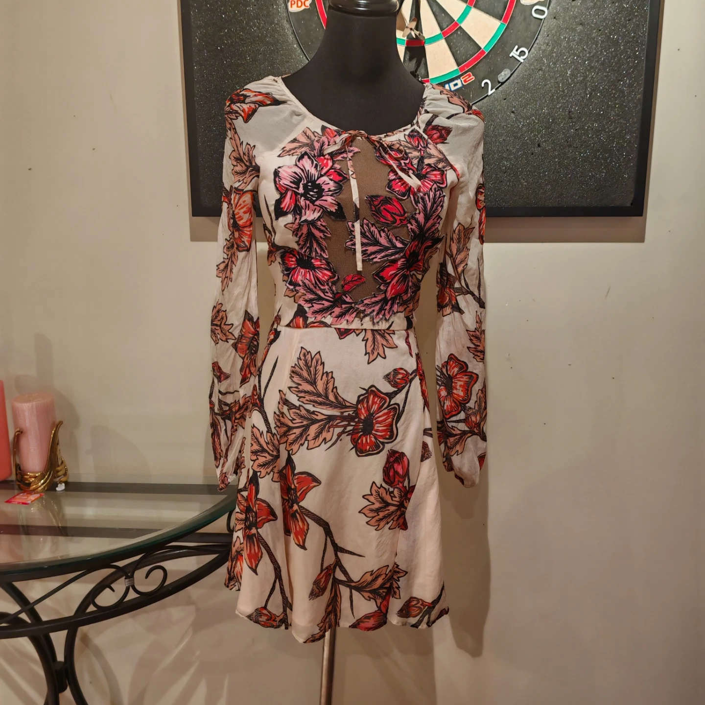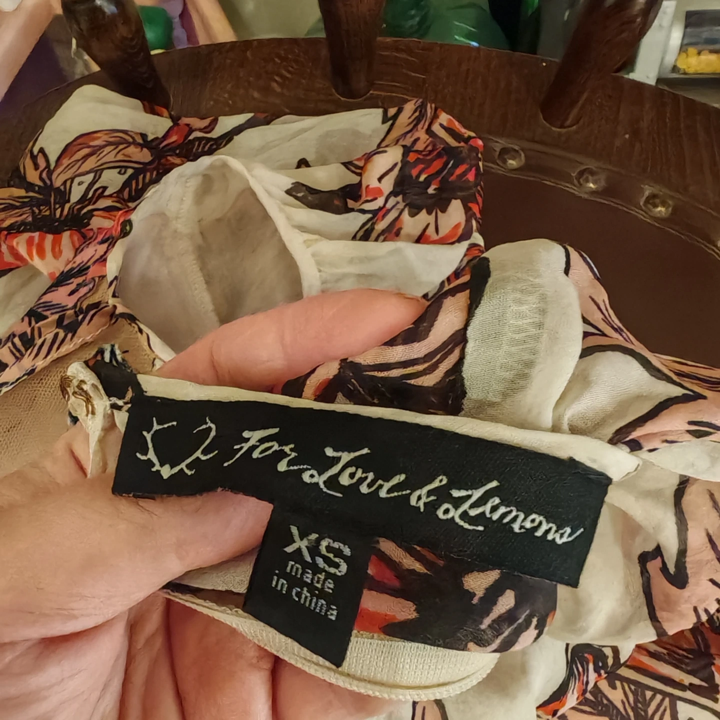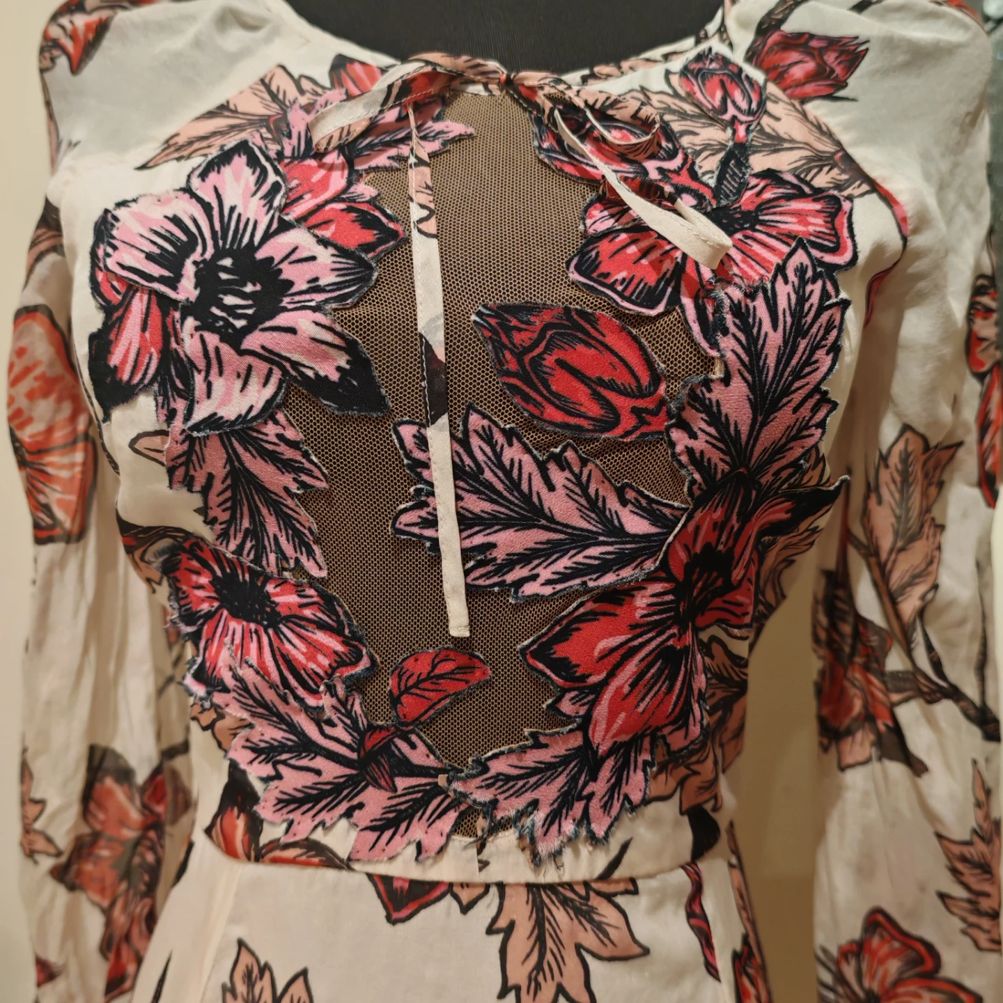 This is a For Love & Lemons dress, size extra small, perfect for a special occasion! This long sleeve, floral mini dress is in good condition and is made of silk, rayon, nylon and spandex. It has a unique and beautiful design that is sure to turn heads.
