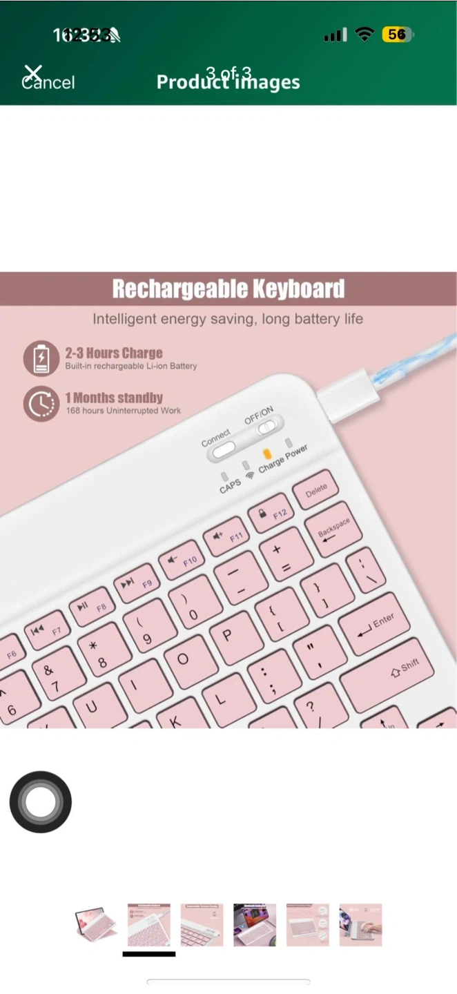 This rechargeable Bluetooth keyboard features pink keys and a white body. It offers 2-3 hours of charge time and 1 month standby. Connects wirelessly to your devices for tablet and smartphone use.