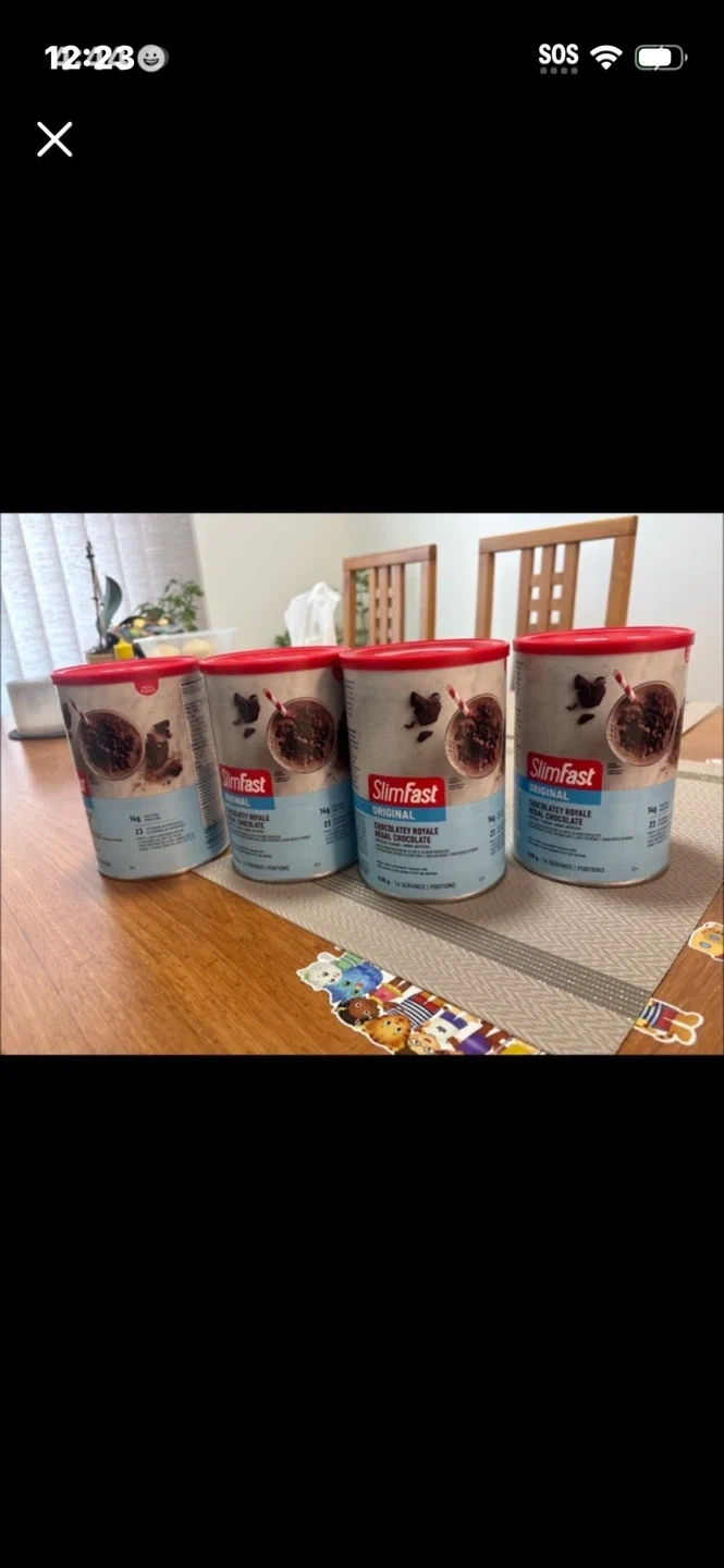 SlimFast Original Chocolatey Royale Meal Shake Mix. Each can contains 14 servings. This is a great option for a quick and easy meal replacement. 20 each Pick up cash only