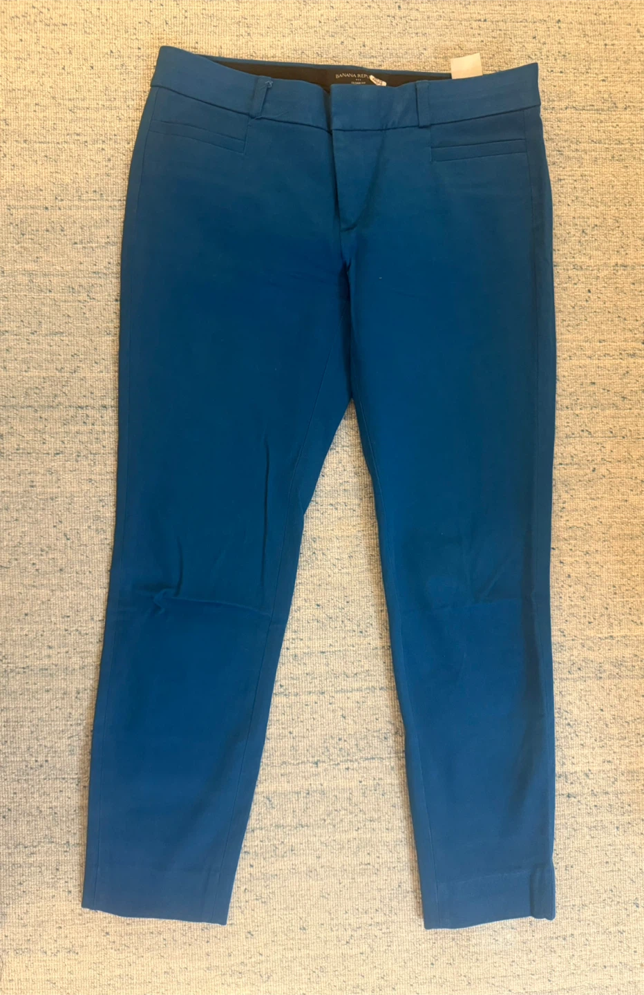 These are Banana Republic "The Sloan" ankle pants in a vibrant blue color. They're made from a comfortable stretch fabric. Ankle length.