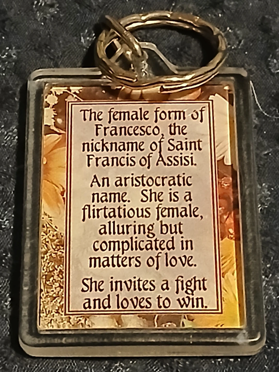 This keychain features the name Frances and details about its meaning. It's made of clear plastic with a gold-tone keyring. A thoughtful accessory for anyone named Frances!