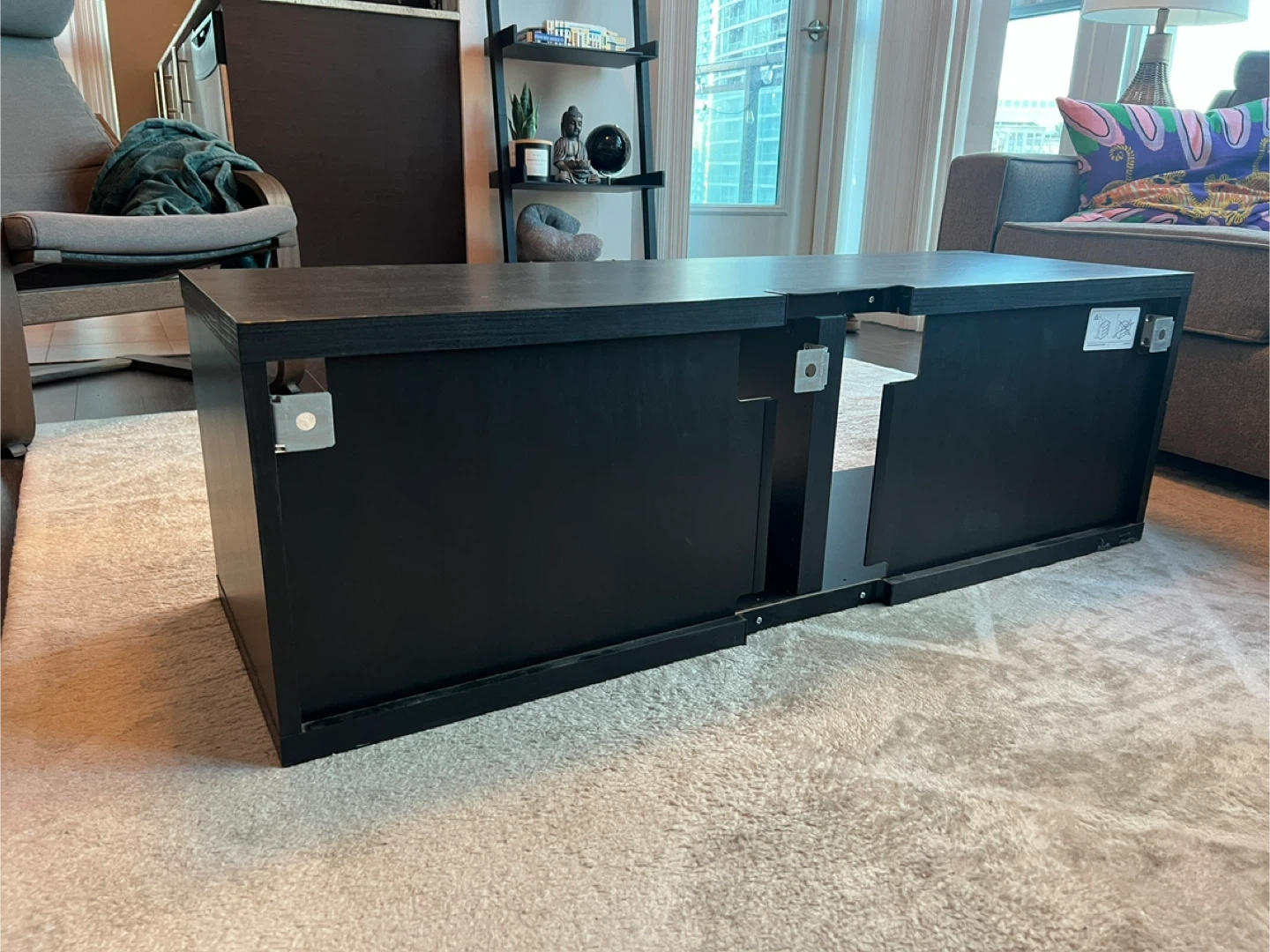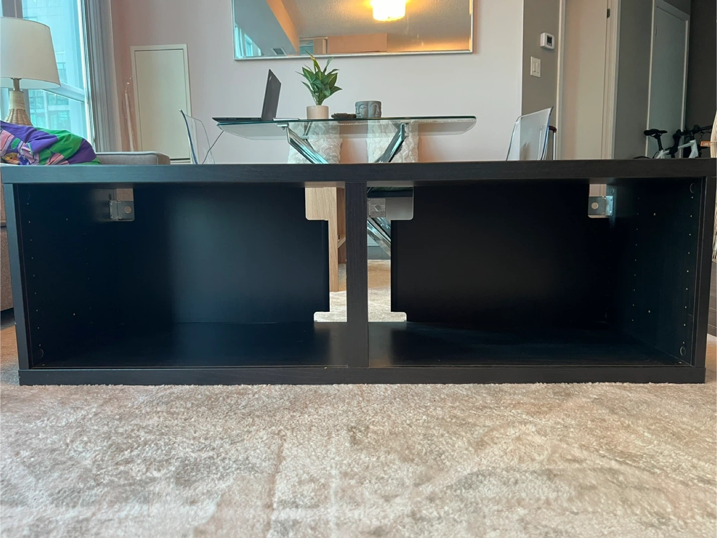 Selling a black TV stand or console table. It's in great shape and would be perfect for a living room or entertainment area. It features two open compartments for storage or displaying items. Solid and sturdy construction!