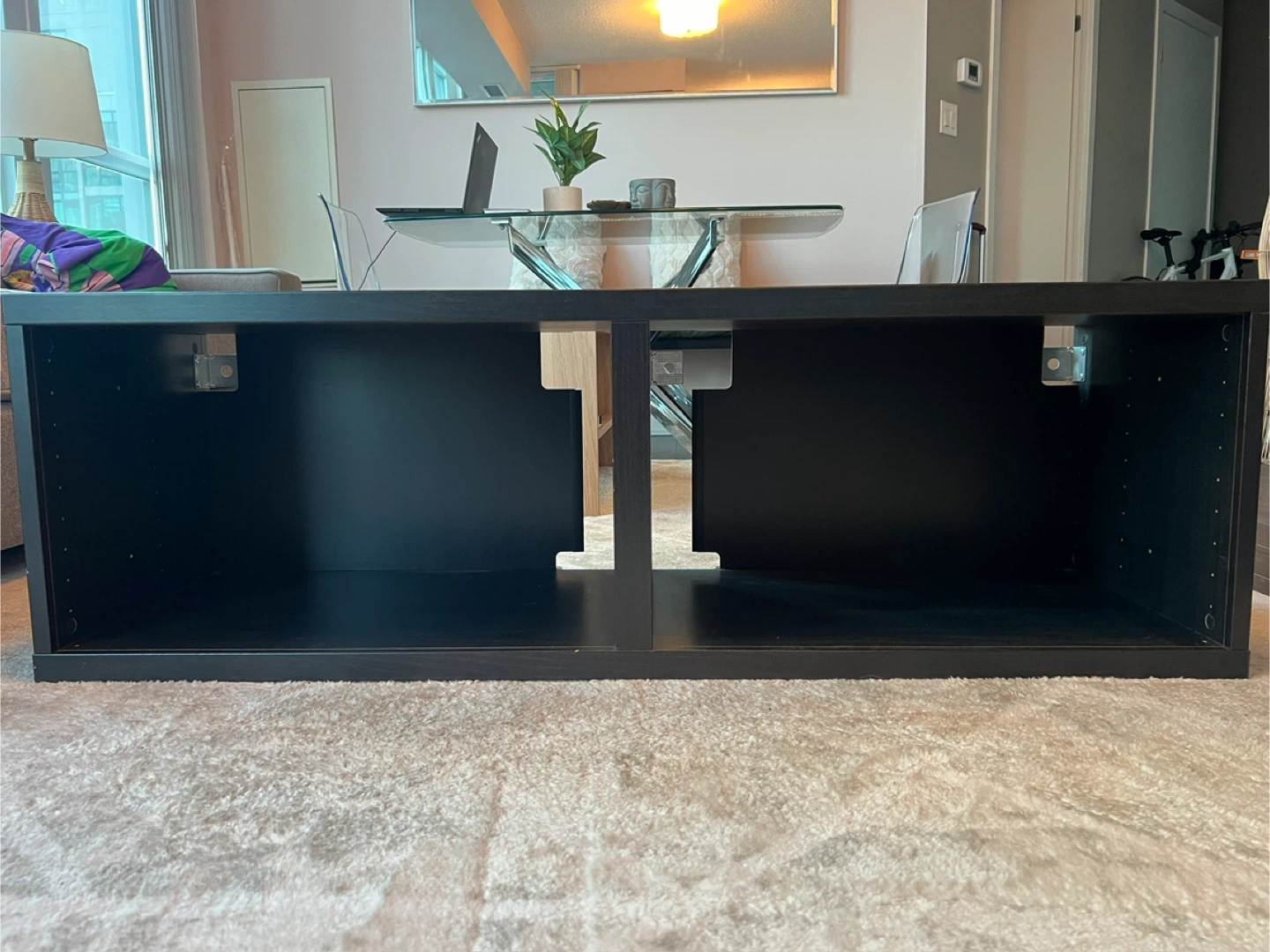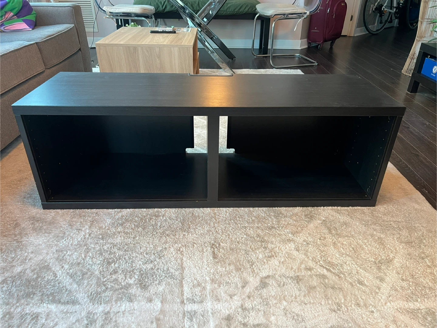 Selling a black TV stand or console table. It's in great shape and would be perfect for a living room or entertainment area. It features two open compartments for storage or displaying items. Solid and sturdy construction!