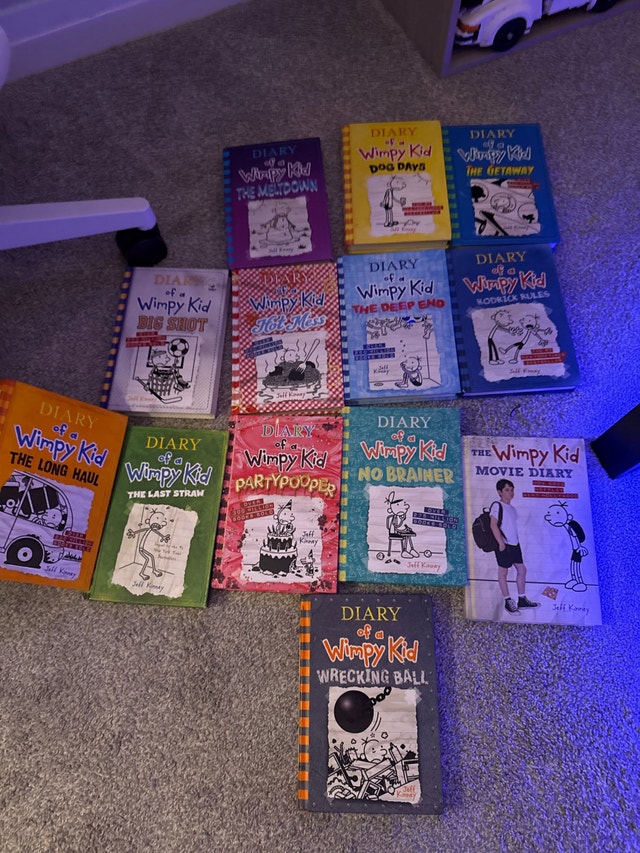 Up for sale is a collection of 12 hardcover books from the popular Diary of a Wimpy Kid series. These are the durable hardcover editions, perfect for adding to a collection or as a gift for a young reader. The covers are solid and the pages are clean. No major rips, tears, or heavy writing inside.