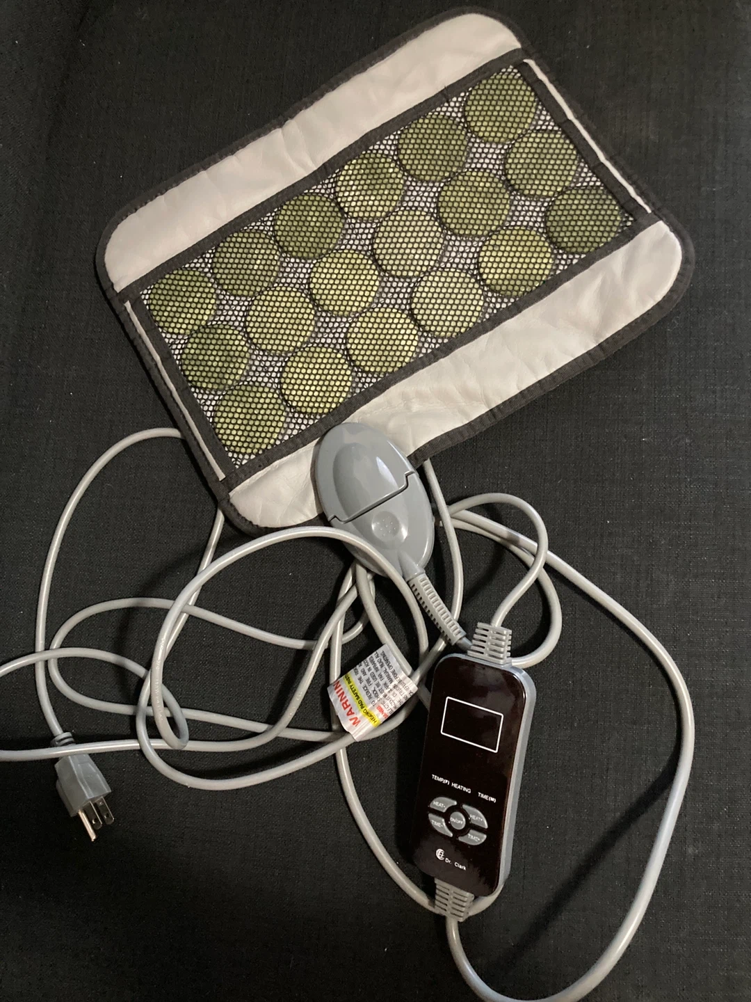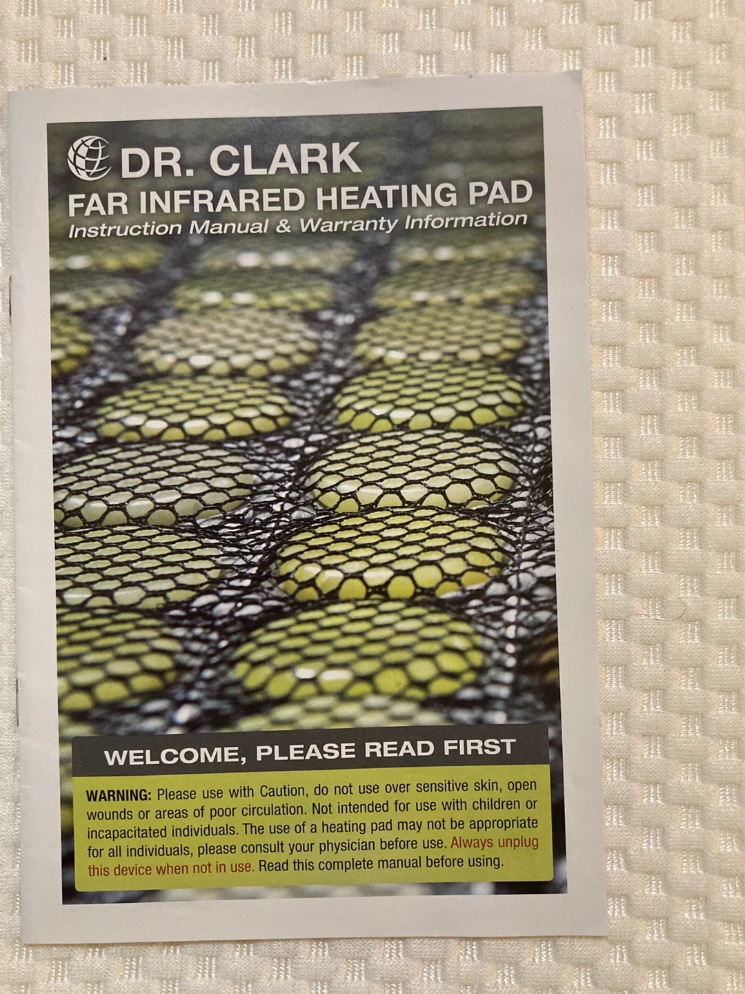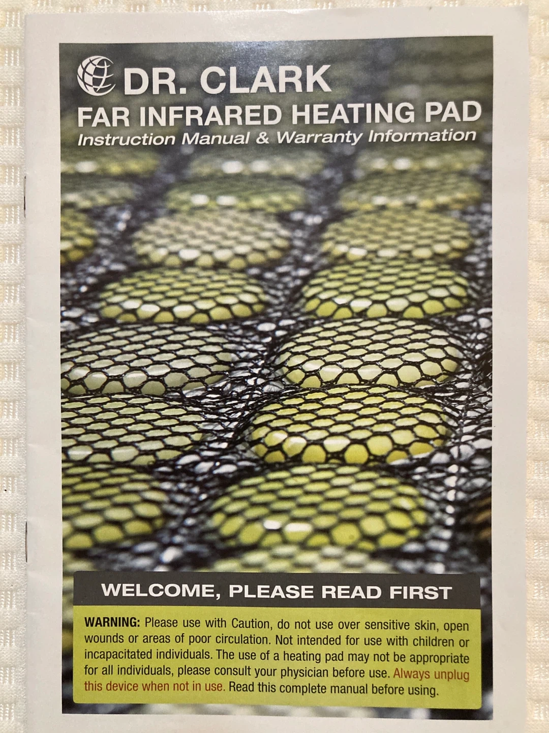Dr. Clark Far Infrared Heating Pad with digital controller. It has adjustable heat and timer settings up to four hours. The pad penetrates deeply for heat therapy.