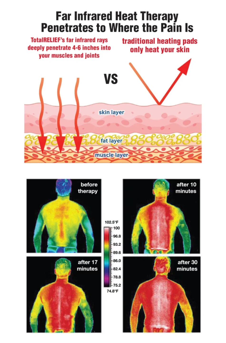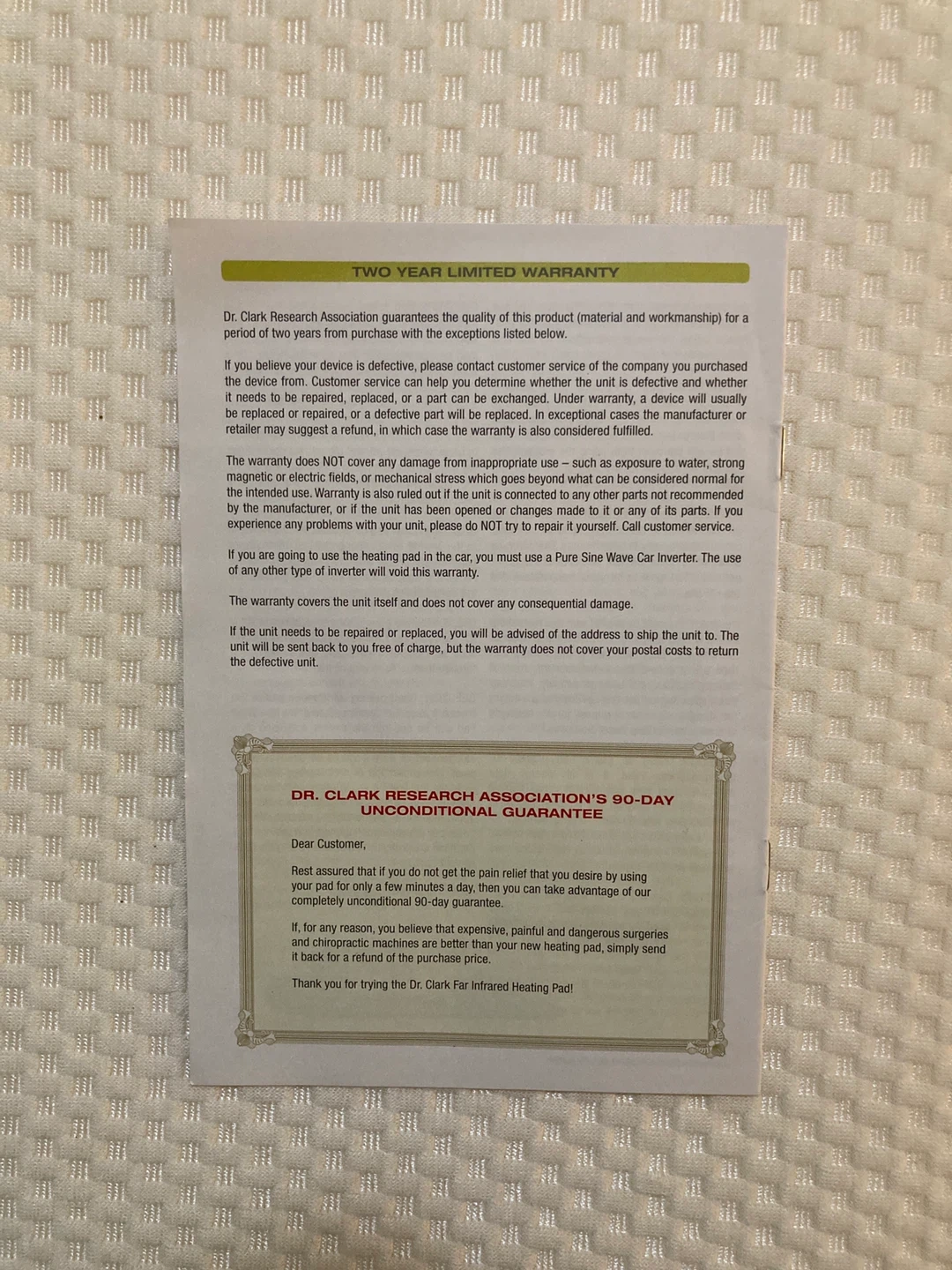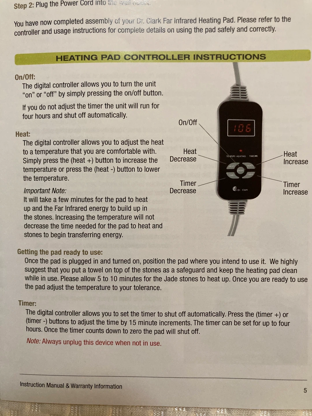 Dr. Clark Far Infrared Heating Pad with digital controller. It has adjustable heat and timer settings up to four hours. The pad penetrates deeply for heat therapy.